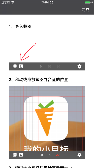 一个协助程序员,设计师,测试和产品经理工作的小工具。 通过将截图放大2、4、8或16倍,快速检查图片中各种元素的大小和位置是否准确。 帮助程序员准确调整坐标。 帮助设计师观察产品。 帮助测试工程师检验实现的准确性。 帮助产品经理验证产品。 功能: 1、为图片打上网格,通过数格子确定元素尺寸。 2、每5小格有一个特殊颜色的大格,方便计算。 3、格子颜色可以变化,增加对比度。 操作方式: 1、点击图片放大一倍。 2、双击图片缩小一倍。 3、单指拖动调整位置。支持暗色模式 适配 iOS 13