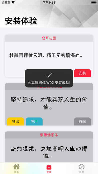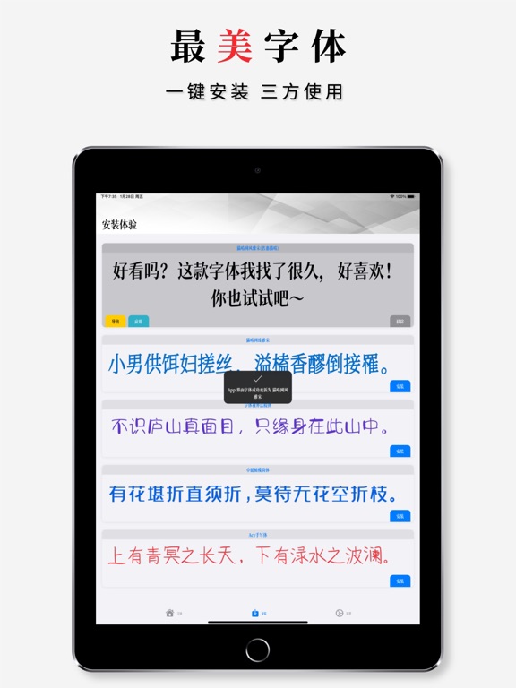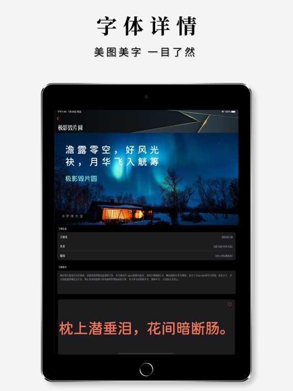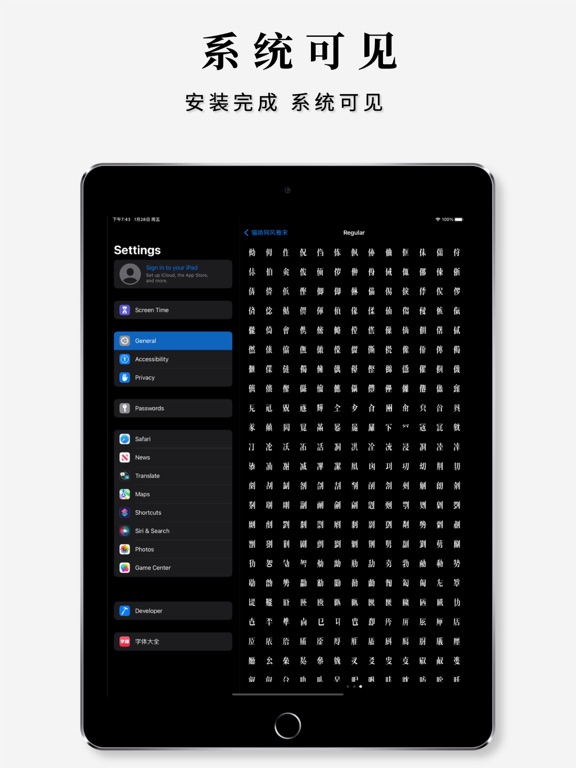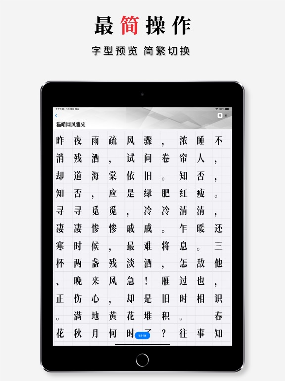 温馨提示:字体成功安装后, 您可在系统的“设置”App >“通用” >“字体” 中查看. 字体大全,您的 iPhone/iPad 必备的专业且免费的字体管理 App, 可以安装数百款中英文字体。 主要功能: * 每一款字体都精心设计了预览图片 * 每一款字体都进行了安全扫描和安装验证 * 一键收藏您喜爱的字体 * 所有字体均免费下载 * 安装成功后可导出 * 可在应用内更换 App icon 安装成功后的字体均可用于您在 iPhone 上创建的文稿中。 若要管理已安装的字体,请前往“设置” >“通用”,然后轻点“字体”。 如需字体一直可用,请勿删除字体 App,否则所有通过本 App 安装的字体都将被删除! 订阅说明 * 成为字体大全会员,你可以解锁所有付费功能,享受未来的免费应用更新及字体更新。 * 确认购买并支付后,将通过您的 iTunes 账号自动续订。苹果 iTunes 账户会在到期前24小时内扣费,扣费成功后订阅周期顺延一个订阅周期。如需取消续订,请在当前订阅周期到期前24小时以前,手动在iTunes/ApplelD 设置管理中关闭自动续费功能。如有试用期,iTunes 账户如不取消订阅,则会在试用期结束时自动开通订阅并扣款,未使用的试用时长在购买订阅之后将会自动作废。本服务由您自主选择是否取消,若选择不取消,将为您开通下一个计费周期的续费服务。 * 隐私政策: a) https://sixplustech.super.site/隐私政策 b) https://www.apple.com/legal/internet-services/itunes/dev/stdeula/ * 使用协议: https://sixplustech.super.site/用户协议更新和优化。 提升流畅度。