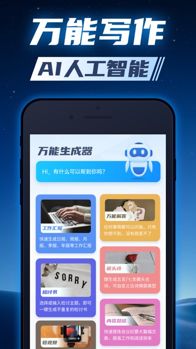 基于前沿AI模型,具有丰富创造力和海量知识库,支持各种AI智能写作,包括工作汇报、作文写作、PPT大纲、短视频、检讨书、藏头诗、内容总结、小红书文案、甩锅助手,还支持各种问答和咨询。 【日报周报】 一键快速生成专业、详细、逻辑清晰的工作汇报,包括日报、周报、月报、季度汇报、年度汇报。 您只需输入简单的要点,比如“拜访了XX客户”、“完成了XX工作”,即可快速生成完整详细的报告。 【智能写作】 支持多种类型的写作能力,包括作文写作、公文写作、PPT大纲、短视频、检讨书、内容总结、小红书文案、甩锅助手等。 【诗歌创作】 快速生成不同风格、不同体裁的古诗歌词、藏头诗等,种类不限;可自定义不同类别,如山水田园、怀古、咏物、哲理等。 【短视频】 快速生成短视频相关的脚本大纲、带货口播稿、内容灵感、吸睛开头等,可自定义不同风格,如正式、专业、幽默等。 【万能问答】 任何问题都可以咨询,只有你想不到,没有答不了的问题,还直接连续追问,不再是简单的一问一答。 【快速便捷】 一键点击,几秒内即可快速生成工作汇报,不需额外操作。 隐私政策:https://docs.qq.com/doc/DRFJjU2ZCc1RpQmtT 使用条款:https://docs.qq.com/doc/DRFd4QVRoZVhlcHlj 【会员订阅】 1、定价:198元/终身,98元/年,69元/季度, 48元/月 2、确认购买后,您的iTunes账户将被收取费用,订阅将会自动续订,除非在当前订阅结束前至少提前24小时关闭自动续订。您的账户将在当前订阅结束前的最后24小时里被收取续订费用,并确定续订开支。 3、如需取消订阅,请手动打开苹果手机“设置”-->进入“iTunes Store 与App Store”-->点击“Apple ID”,选择“查看Apple ID”,进入“账户设置”页面,点击“订阅”,选择取消订阅即可。 功能还在丰富中,大家有什么需求欢迎随时联系反馈:aitoolhelp@163.com- 优化产品体验