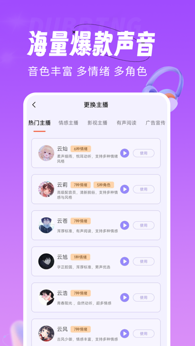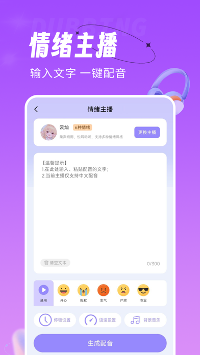 配音师,是一款专业的文字转语音配音合成软件,支持AI配音、情绪主播配音、多人配音、多语言配音、方言配音和真人配音,采用强大的语音合成技术,高端的配音主播,打造简单高效的配音服务平台。 --------【核心功能】-------- 1、智能合成 2、真人配音 3、文案模板选择 --------【产品特点】-------- 1、智能配音:多种热门配音主播任您选择,普通话、方言、英文、日文、韩文等等千款音色,输入文字、选择配音主播、添加背景音乐,一键合成自己想要的配音,简单高效。 2、真人配音:我们有数名国家级配音员、从事配音工作数十年的老师入驻配音师,是设置彩铃、制作广告配音、公司宣传片配音的最佳选择。 3、配音模板:提供商业广告配音、政企宣传片配音、彩铃配音等多种tts配音场景模板。 4、一键导出:一键导出MP3,多平台分享至好友。 5、视频编辑:可以编辑、裁剪您的视频,去除视频头尾的无用内容,也可以添加您喜欢的背景音乐和配音,帮助您快速的制作震撼效果的视频。 --------【适用场景】-------- 1、广告促销配音:商场广告促销配音、地摊叫卖配音等 2、有声阅读:将小说、杂志、课本、童话音频化,打造个性化听书包的文字转语音助手 3、彩铃制作:制作企业彩铃,个性化彩铃,个人彩铃,企业彩铃,手机彩铃。 4、解说配音:企业专题片、建筑动画、工程标书解说等配音解说。 5、英语配音:可以作为听力材料,可进行电影台词、出版物、广告语、企业宣传片等进行英语配音。 6、影视配音:广告片配音、影视片配音、动画后期配音。 7、广播配音:学校、企业、车站、机场、商场的广播播音。 客服QQ群:485544395 恭听您的意见和建议!1.修复部分主播不能合成的问题