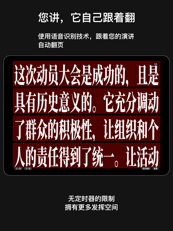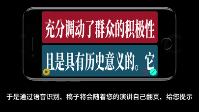 当您发表讲话、进行演说时,请先提前将稿子录入到自动提词器中。 然后只需要将设备放置到自己能够看清楚的位置。 自动提词器就会通过语音识别,自动地跟着您的演讲进度进行翻页。让您时时刻刻和您的稿子保持同步。 - 优化过的适合提词器的字体显示,高效紧凑而又清晰 - 双行文本设定,通过更改非注意文本,让您能保持集中的精力 - 无需网络连接的语音识别,让您面对各种情况时不用担心网络环境的连接。 订阅信息 -订阅选项: 完全功能解锁 38元/年 - 付款:用户确认购买并付款后计入iTunes账户 - 取消续订:如需取消续订,请在当前订阅到期24小时之前,手动在 设置/iTunes Store与App Strore/Apple ID 设置管理中关闭自动续订功能(具体请参考http://support.apple.com/kb/ht4098) - 续订:苹果iTunes账户会在到期前24小时内扣款,扣款成功后订阅周期顺延一个周期 -隐私政策 https://eoikoe.com/mmc-privacy-policy -使用条款 https://eoikoe.com/autocueuse - A link to the terms of use in either the app description or EULA field of App Store Connect. (Please visit http://support.apple.com/kb/ht4098 for more information)- 新的智能语音识别算法支持模糊语义 - 支持双击ApplePencil翻页 - 支持字体调节 - 新的多行分栏内容展示 - 语音支持预览