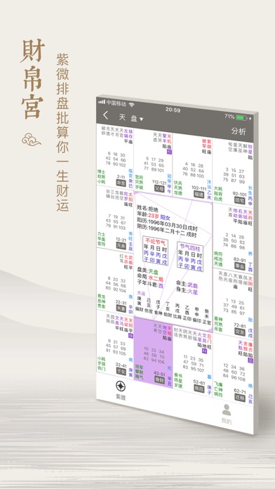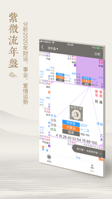 紫微斗数——以一个人的生辰八字为基础,结合紫微斗数原理为用户排盘的工具app。 紫微斗数有以下几种排盘:天盘、流年盘、流月盘、流日盘。 天盘: 1、命宫:分析先天个性、能力、运势灯情况,代表人格的正负特指和潜在的思想观念; 2、夫妻宫:分析恋爱发展状态,个人在婚姻、配偶方面的信息; 3、兄弟宫:分析个人和兄弟姐妹间的相处情形; 4、财帛宫:分析财运好坏、金钱支配情况和赚钱能力等; 5、疾厄宫:分析个人的健康状况如何; 6、福德宫:分析个人福分,精神上是否能享福或苦闷; 7、子女宫:分析亲子关系,推测子女人数多少,子女性格、健康等信息; 8、田宅宫:分析个人家中产业有多少,生活环境等信息; 9、事业宫:分析个人的职业优势、职场能力和发展反向; 10、交友宫:分析个人与朋友、同事等的人际关系; 11、迁移宫:分析个人是否会到他乡求发展、外出的运势等信息; 12、大师指点:总结个人的命理情况,提供专业的点评和建议 流年盘:通过排盘预先查看这一年十二宫会发生什么变化,推算未来这一年的发展运势; 流月盘:通过排盘查看每个月的十二宫变化情况,推算每个月的发展运势; 流日盘:通过紫微排盘查看当日的运势,推算会遇到什么事情,并指点开运方法。 下载【紫微斗数】,知天命,掌握运势,为自己的未来保驾护航。1、优化2020运程数据 2、修改产品描述内容