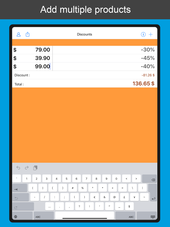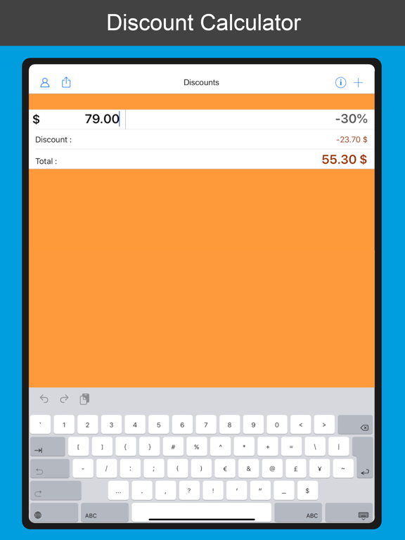 «打折计算器»軟件帮您计算折扣后的购买量。 -70%-35%-20%...你会得到最终的价格和收益。 您也可以用不同的折扣添加多个产品,然后与你的朋友分享你的优惠价! Discounts Premium是每月定期订阅。 在免费试用期结束时(7天),您将自动通过App Store向您收取金额(14.99 USD)。 除非在当前期间结束前至少24小时取消,否则每月订阅会自动续订。 您的帐户将在当前期间结束前24小时内收取续订费用。 免费试用期的任何未使用部分将被没收。 您可以在App Store中管理您的订阅。 Terms of use: https://ar-code.co/apps/discounts/terms.html Privacy policy: https://ar-code.co/apps/discounts/privacy.html- Improvements for speed and reliability