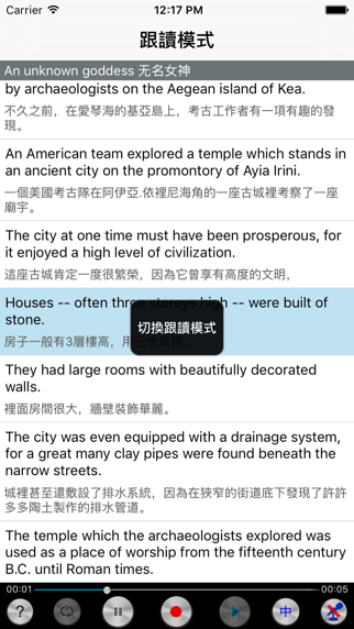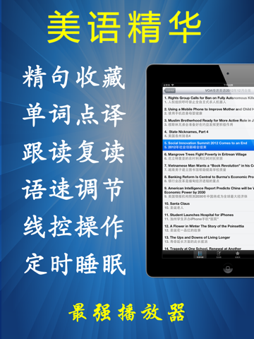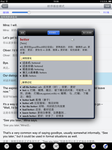 强大的播放模式,便捷的触控体验!支持单句收藏,跟读录音,内置全文有声字典,即点即查,因此体积较大,请务必在WIFI环境下下载,以免过多消费流量。下载完毕,即可离线使用! 软件支持iPhone、iPod touch、iPad等各版本的硬件设备并针对高清显示屏做了专门优化。 ***软件特色*** 1、资料丰富 2、纯正英国口音:不需要再纠结口音问题,迅速掌握英式英语的发音技巧 3、多种播放模式选择:单句循环、单课循环、课程连播、对比播放、是否显示中文译文播放等等,适合各种学习模式,能帮你迅速提升英文听力能力 4、强大的口语练习模式:每一句都可跟读,反复对比或者循环播放口语发音,帮你快速掌握发音技巧,练习口语尽在掌握 5、单词长按显示词典查询功能:学习课文中遇见不熟悉的单词,手指长按在上面即可显示单词释义,并可随时加入生词本,真正做到哪里不懂点哪里 6、完善的全能单词词库:包含简明解释、单词联想记忆、词性变化、同义词辨析、英英解释、丰富的用法例句等等,帮你快速理解背诵记忆单词 7、实用性强:既有专业的词汇解读,也有生活化的语言。让你不出国门,了解美国的生活会话习惯,帮助你快速融入- 修復bug