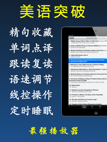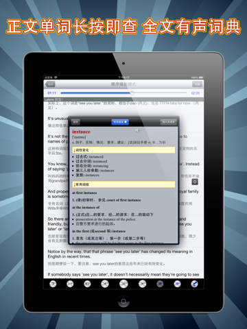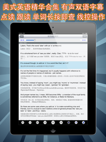 强大的播放模式,便捷的触控体验。请仔细阅读操作说明,获得最佳体验! 内置全文有声字典,即点即查,因此体积较大,请务必在WIFI环境下下载,以免过多消费流量。下载完毕,即可离线使用! 美式英语精华合集是一个的强大的美式英语有声教程。内容包含新英语900句基础篇和生活篇等。从日常生活场景对话,社交商务场合礼仪及交谈技巧到美国社会与文化, 音乐, 电影, 娱乐体育, 题材丰富, 时尚, 有趣. 课程难度适中,既有初级的英语对话会话技巧指南,也有适合初高中学习的单词词汇解析。 应用内分免费与付费内容两部分,所有功能均免费开放。欢迎使用体验,一次购买全部内容,终身免费升级。 本APP精选了200多课英语教学课程,每课都配有详细的中文字幕,并配以强大的播放器,单词即按即查(联想记忆、常用词组、同义词辨析等),课文内容轻松点读、口语跟读练习、支持后台播放、多种播放学习模式! 所有内容均为离线模式,不需要连接互联网,软件支持iPhone、iPod touch、iPad等各版本的硬件设备并针对高清显示屏做了专门优化。 *** 软件特色: 1、资料丰富,共200多课。其中1/3为免费内容,无需任何购买也能满足日常学习需要 2、纯正美国口音:不需要再纠结口音问题,迅速掌握美式英语的发音技巧 3、多种播放模式选择:单句循环、单课循环、课程连播、对比播放、是否显示中文译文播放等等,适合各种学习模式,能帮你迅速提升英文听力能力 4、强大的口语练习模式:每一句都可跟读,反复对比或者循环播放口语发音,帮你快速掌握发音技巧,练习口语尽在掌握 5、单词长按显示词典查询功能:学习课文中遇见不熟悉的单词,手指长按在上面即可显示单词释义,并可随时加入生词本,真正做到哪里不懂点哪里 6、完善的全能单词词库:包含简明解释、单词联想记忆、词性变化、同义词辨析、英英解释、丰富的用法例句等等,帮你快速理解背诵记忆单词 7、实用性强:既有专业的词汇解读,也有生活化的语言。让你不出国门,了解美国的生活会话习惯,帮助你快速融入. 您在使用过程中遇见任何疑问或有任何建议,可随时通过软件里的帮助支持链接来与我们取得联系。- bug fixes