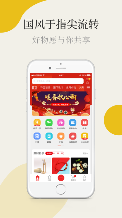 拾尚是一个集文化创意产品交易、互动社区、直播、特色文博/文旅推介等于一体的私人定制DIY创意电商购物平台。在拾尚可以看到有故事、有内涵、文艺范儿、国风范儿、原创范儿、古风范儿等的创意文化美物,那些追寻“诗和远方”的人们都能在这里找到心灵的归属。 【匠心商城】 拾尚平台上筛选了一大批有态度、有风格、有创新的设计师、匠人、原创卖家入驻,囊括了100000+全品类的优质高格调创意产品。 【好物历史】 一物一故事,物因为有了故事,便有了灵魂和生命,在拾尚每一个商品的诞生,都包含独特的设计理念或一段故事。在拾尚用户可以轻松寻到符合自己腔调、风格的商品,而且拾尚的商品不仅是承载用户生活感悟的一枚介质,还是一件收藏级臻品,为文创、收藏爱好者提供一站式购物体验。 【新人福利】 注册下载拾尚APP,享超低新人价 全品类商品:DIY定制/国风设计/文房书画/茶道雅器/文玩雅趣/珠宝玉翠 拾尚秒杀:每天两场限时秒杀,低至1元 拾尚拍卖:甄选商品0元起拍,捡漏结缘 打卡签到:连续签到,积分兑换精美礼品/优惠券 【互动社区】 爱生活,爱创意,爱分享的你,在这里可以充分找到归属感,拾尚平台打造互动社区,为文化创意爱好者、创造者架起沟通的桥梁。 在这里可以开展线上头脑风暴,分享生活,结交志同道合的朋友,打造自己的朋友圈,成为创意KOL,真正体验掌上购物的乐趣。 【拾尚直播】 拾尚平台签约众多优质商家、名家匠人、创意达人,用户可通过看直播与他们近距离接触,学习手工技巧,探讨东方文化、时尚潮流方向。 直播展示大师作品、原创设计作品,用户直接与匠人、设计师对话,以超值的价格结缘心仪的匠心手作,带来真实的逛街购物体验。 【文博文旅】 用步履丈量文化之路,用心灵感受传统东方神韵,拾尚在追溯和传承历史文化的道路上步履不止。拾尚致力聚集全国各地博物馆开发的文创及相关衍生产品,聚集文旅之路上的特色技艺和匠人手作于平台内。 用户在这里可以查阅、赏览全国各地博物馆的文化印记、精品馆藏,也可购买博物馆、旅游景点相关衍生品,匠人特色手作。让没有时间旅游的我们,足不出户追溯千年往事,探究历史文化印记,也激励我们走出去,去亲近我们的历史文明,传承历史文化。 联系方式: 1.拾尚APP:点击【我的】-【意见反馈】 2.官方微博:拾尚匠心造 3.官方微信客服:swwgfwx(小尚君) 4.官方微信订阅号:拾尚国风文创 5.客服热线:400-8837-3221、拼团和视频直播商品增加多规格支持。 2、优化用户体验,修复部分问题。