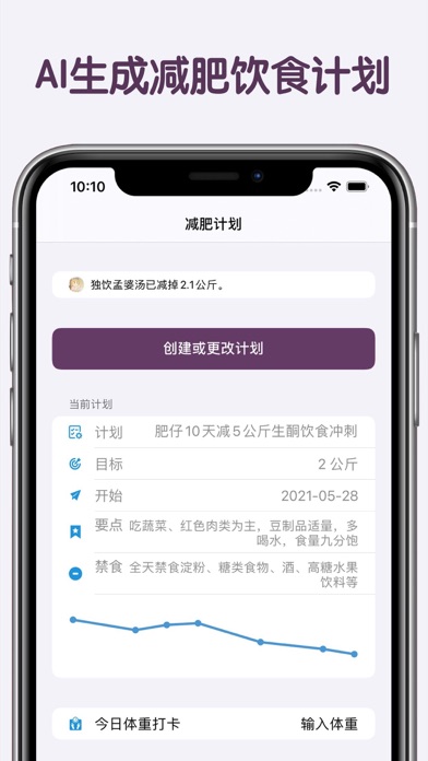 -- 统计表明 -- 10日内减掉的体重平均超过5斤! (1) 《减肥十日速瘦》从分解脂肪的根源入手, 通过10天的减脂餐调整, 并配合独家的减肥音乐, 彻底断绝人体脂肪合成信号, 直接激活人体内自然的脂肪分解代谢, 开启人体自身的减肥功能, 从而达到健康减肥的目的。 ------------------- -- 5大法宝, 保证10日安全减掉6斤 -- ------------------- - 1. 食物照吃不误, 不饿肚子, 仍然能减肥, 容易坚持! - 2. 不吃任何减肥药, 不催吐, 不催泻, 减肥有道! - 3. 不用特意运动, 不必特别按摩。只需偶尔抽出3分钟来, 按照本软件要求进行自我放松和简单按摩即可。 - 4. 每天详细的减肥操作步骤、食谱等, 让减肥简便易行。 - 5. 独特的减肥音乐, 修复脑电波的脂肪分解信号, 可以直接刺激人体自身的脂肪分解代谢。 本减肥法, 不使用任何外界药物, 100%纯天然食物, 100%安全。 经过美国、日本和台湾等地区数百万人, 长达30年的临床试验, 有效率达到99.91%。男性10日平均减重3.5公斤, 女性10日平均减重3.1公斤。 -软件功能- - 完整的体重数据管理。 - 强大的体重曲线。 - 播放特有的减肥音乐。 - 提供每日饮食的详细步骤。 (1) 参与统计样本的减肥者有如下指标范围:减肥之前, 男性体重在160斤以上, 女性体重在120斤以上, 并且经过脂肪测定,体内有超过20%的脂肪的用户(健康的人体中脂肪占比在10%-15%之间)。用户这10天的饮食必须严格按照本减肥软件的要求来进行。而且,在使用本减肥法之前的2个月内, 没有进行过任何类似的减肥行为。统计样本数量是1102。重量或脂肪比例低于上述数字的减肥者,减掉的体重可能会少于平均值。AI自动生成减肥食谱和计划。 每日打卡,享受减重的快乐。 支持最新的苹果操作系统。 支持最新iPhone手机和iPad Pro。