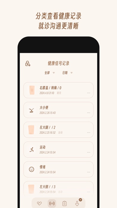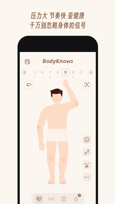 你的身体,比你想象中更爱你,也更懂你。 疼痛、不适、失眠、焦躁……都是身体在发出信号,提醒你关注自己的身心状况,帮助你发现潜在的健康问题。遗憾的是,这些信号常常被忽视和遗忘。 - 在日常,BodyKnows 会提醒你更多关注自己,留心健康隐患。 - 就诊时,BodyKnows 还能帮助你更清晰准确地描述过往症状。 ◎轻松记录 用可爱插画替代解剖图,点击身体部位,选择疼痛/不适的等级、类型等,快速完成症状记录。 ◎详细总结 每月生成健康报告,用可视化数据图表,多维度直观回顾身体动态,针对性提醒健康问题。 ◎专属提醒 根据健康信号的部位、频次、类型等,推送个性化健康提醒,帮助发现健康隐患。 ◎贴心细节 桌面小组件一键记录、性别切换、加密设置、分类记录查看…… 来吧,一起用 BodyKnows 记录身体动态,好好对待身体给我们的信号。 ————————————————————————