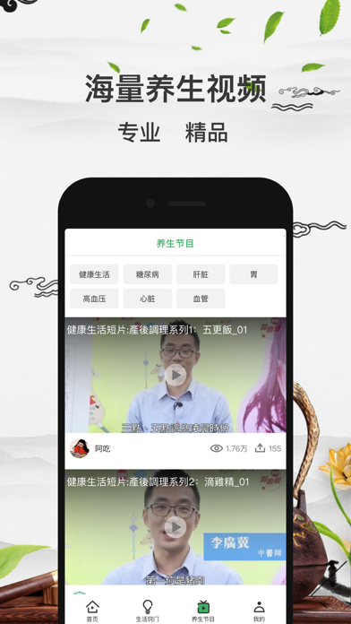 养生宝APP简介: 【产品简介】 养生宝,您24小时移动在线的养生小助手! 海量专业健康及养生知识视频,只有你想不到的,没有我们不知道的,让您轻松掌握新鲜的专业的养生和健康知识,让养生变得更加轻松。 【产品特点】 1.海量专业养生视频资源。 2.更新速度快。 3.视频来源权威。 4.可任意分享到家庭群,朋友圈。 5.重要视频即随时收藏。 6.视频分类,快速精准获取内容。 【用户寄语】 健康是生命之树的坚实根基,也是每一个人希望拥有的财富。我们希望养生宝能为每个家庭带来改变、带来健康。身体是本钱,也是一切之源!让我们一起健康养生,热爱生活。修复bug