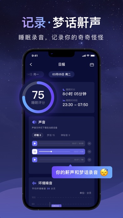 睡眠困难?告别不眠之夜,不再错过甜蜜的梦乡! 《睡眠小乖》是一款舒缓情绪,放松入睡的健康睡眠应用程序,我们提供可以改善睡眠和放松的自然声音氛围,通过多种贴近自然的声音与场景,帮助您放松缓解,安抚神经,获得一夜好眠,以及专为您策划的专业指导来帮助您了解和改善您的睡眠。 《睡眠小乖》能够帮您: - 缓解失眠,轻松入睡; - 放松并舒缓生活的压力与焦虑; - 隔绝喧嚣的噪音,睡眠不被打扰; - 午间小憩,恢复状态,提高工作效率; - 声音冥想,降低焦虑,恢复您的健康; - 集中注意力,在学习或工作时保持专注; - 改善生活,成为更好自己的你; 《睡眠小乖》适合人群: -睡眠质量差 失眠、多梦、易醒、睡醒后还是很累; -记忆力下降 前一秒还在想要做什么,下一秒就忘了; -思维迟钝 大脑常出现“短路”,慢半拍,灵感匮乏; -容易情绪化 焦虑、压抑、急躁、抑郁、敏感脆弱; -注意力不集中 做事容易分心,拖延、散漫、效率低; -健康意识强 关注自我成长与身心健康,想提高生活幸福感; 产品功能与特色: - 自由组合白噪音,创造独有音乐库; - 清晰睡眠录音,记录您的梦话鼾声; - 精准睡眠报告,直观您的每一次睡眠; - 专业的睡眠检测,更好分析健康状况; - 海量高音质、清晰又舒缓的睡眠声音; - 自定义睡眠提醒,提醒您的睡觉时间; - 自定义睡眠时长,并自动关闭声音; 【免责声明】: 本应用程序提供的包括但不限于睡眠报告、健康改善建议或其他建议,仅供参考。如您在使用本应用的过程中,需要做出医疗决定,请务必先寻求专业治疗机构和医生建议。1.优化用户体验 2.修复已知bug