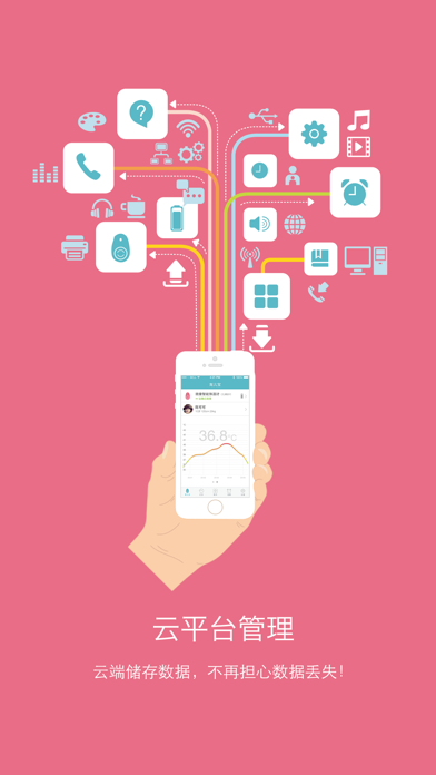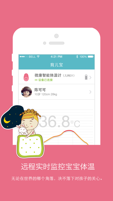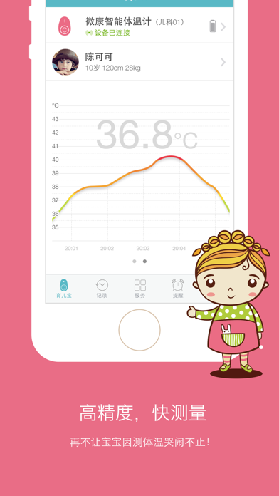 育儿宝是一款主要面向儿童的体温测量、监护系统。通过蓝牙收集智能体温计的数据,可实现对儿童体温的持续无间断监护,并能在体温过高时通过声音、短信、邮件等多种方式进行报警或通知。帮助家长轻松掌握小孩的温度变化,及时处理。适配iphone_x 手机型号