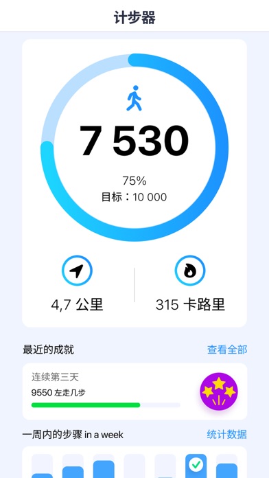 使用计步器,一切都比您想象的要容易。 只需迈出第一步。 使用我们可靠且易于使用的计步器和内置传感器,以准确计算步数。 而不仅仅是脚步声。 计步器还显示燃烧了多少卡路里、行进距离、步行得分和完成目标的百分比。 优点: ▪ 不会耗尽手机电池; ▪ 主屏幕上的所有必要信息; ▪ 目标和成就; ▪ 每小时、每天和每周的统计数据; ▪ 您的进度显示在通知中; ▪ GPS 追踪; ▪ 自动计数(无需手持手机)。 请注意: - 为获得最准确的结果,仅在您实际移动时打开计步器; - 计步器与 HealthKit 集成以获取您的身体数据:活动能量、身高、性别、步数、步行和跑步距离、体重。 请允许应用程序访问此数据以确保其准确和正确的工作。 订阅 通过高级访问摆脱广告并解锁所有酷主题: - 通过获得为期三天的免费试用来检查它的优势。 3天后,试用会自动转为周付费订阅。 - 付费订阅分为 3 种类型:每周、每月和每年。 - 一周付费订阅费用为 9.99 美元。 月 - 19.99 美元。 年 - 49.99 美元。 - 付款将在确认购买时从您的 Apple ID 帐户中扣除。 - 您可以随时取消订阅或免费试用,但至少要在当前期限结束前 24 小时。 否则,它将自动更新。 - 账户将在本期结束前 24 小时内收取续订费用。 - 购买后,您可以在帐户设置中管理订阅并关闭自动续订。 - 当您购买订阅时,任何未使用的免费试用部分都将被没收。 - 阅读我们的隐私政策 https://appenvisions.com/privacy.html。 和 EULA https://appenvisions.com/eula.html。New features and improvements await you in this update: - Improved performance and stability - Fixed bugs