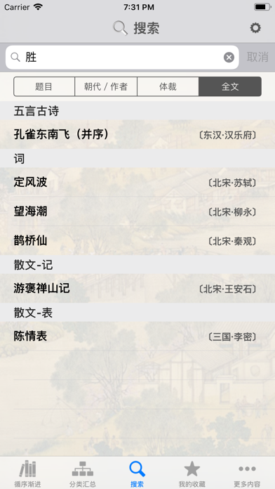 《古诗词赏析•朗读版》是您欣赏和学习中国古典诗词的最好工具。 一、精选收录:《古诗词赏析•朗读版—高中必修篇》收录了高中语文教材(人教版)中的经典古典文学作品共三十余篇(列表见后)。 二、内容全面,朗诵声情并茂:本软件的每一篇文学作品都有配乐朗诵、作品(或作者)简介、原文、注解、译文、名句、评析等七大内容,可使您在大饱耳福的同时,增加对古典文学作品的理解。同时,一篇篇精到的评析文字,对古典文学作品的作者和作品、内容与形式、价值和意义、色彩与意境、构思与手法、语言与修辞等均作了极为深入、透彻的剖析,多角度、多层次地揭示了古典文学作品的丰厚内涵。这不仅能帮助用户掌握作品的来龙去脉,品味意象、语言的精美,使用户受到熏陶与感染,而且还会大大开拓视野,培养探究能力,增强文化底蕴。 三、分类详细:本软件经过我们精心设计,将古典文学作品按照作者所处朝代进行了仔细划分,涵盖了西周、东周、秦、汉、三国、西晋、东晋、南北朝、唐、五代十国、北宋、南宋、金、元、明、清、民国等二十余个朝代、三千多年的历史跨度;同时又将古典文学作品按照体裁进行了仔细归类,包括了四言古诗、五言古诗、七言古诗、杂言古诗、五言绝句、七言绝句、五言律诗、七言律诗、词、曲、语录、辞、记、表、说、铭、史传、赋、骈文、序、论等二十余种文学体裁,非常方便您的阅读。 四、全方位搜索:本软件提供了全方位的搜索功能,可“按题目搜索”、“按作者搜索”、“按朝代搜索”、“按体裁搜索”以及“全文搜索”,非常方便您的使用。 作品列表: 沁园春•长沙 烛之武退秦师 采薇 离骚(节选) 短歌行 归园田居(其一) 登高 锦瑟 劝学(节选) 师说 雨霖铃 念奴娇•赤壁怀古 永遇乐•京口北固亭怀古 声声慢 归去来兮辞(并序) 陈情表 将进酒 兵车行 蜀相 虞美人 鹊桥仙 屈原列传(节选) ...1.修复Bugs; 2.适配iPhoneXS Max、iPhoneXR、iPhoneXS及iPhone X。