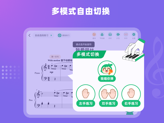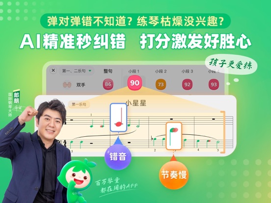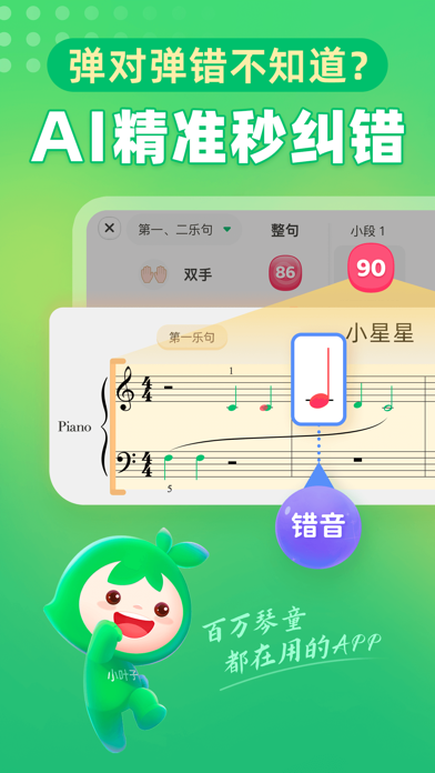 -----市场地位----- 专业推荐:国际钢琴大师郎朗亲测推荐 技术领军:小叶子测评算法和琴音识别能力领跑行业,十年数据积累,十亿级大数据库,不断优化算法模型,智能识别准确度行业领军。 市场领先:2022年全球顶级权威咨询公司弗若斯特沙利文(Frost & Sullivan)确认小叶子音乐科技在中国钢琴学习市场全国用户量遥遥领先。 -----产品特色----- 高效练琴神器:练琴进步快,就用小叶子 【精准纠错——行业领先的纠音准确率99.99%】 弹对音符变绿,弹错光标停止不前,停顿超5秒给予键盘提示,错音、漏音、错节奏及时纠正,辅助黄色小键盘标识,提升识谱能力,不懂钢琴,也能一眼识别练琴错误! 【个性指导——效率更高,回课进度快】 多维度评分,个性化练琴方案,分手、合手练习,智能分析练琴问题,找到薄弱环节,筛选练习重点,有效练习,进步更快! 【打分排行榜——激发练琴积极性】 每次练琴都有打分,进步看得见,还能与全国千万琴童一起PK,练琴更主动! 【入门到十级——10万+海量钢琴琴谱、乐理题库】 古典到流行,入门到十级,小汤到大汤、车尔尼到莫扎特,想要演奏的曲谱,即刻智能为你找到。乐理动画系列故事、钢琴考级必备,帮助孩子学习乐理知识,激发练琴兴趣! 零基础趣味学琴:学琴进步快,就用小叶子 【铃木音乐教学法+权威教材——专业学琴,效果好】 通过“学、练、演、测、拓”五个环节,让零基础学习者真正感受音乐艺术、轻松掌握演奏技巧。 【游戏化学习趣味互动——学琴不枯燥,简单易学】 游戏化学习,利用人工智能技术进行趣味互动,赏析,节奏游戏训练、趣味问答、演奏练习等多个环节,让学琴有趣,不枯燥! =====联系我们===== 微信公众号:小叶子钢琴智能陪练 客服电话:400-029-2609优化了使用体验~