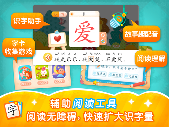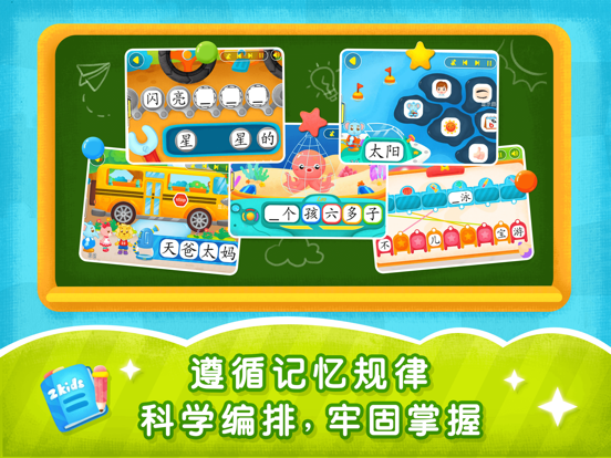 趣味识字课程 + 分级绘本阅读 = 轻松掌握常用基础汉字 快乐识字,轻松阅读,让孩子养成良好的阅读习惯。 >> 趣味高效的识字游戏软件,孩子主动学,爱学习。 >> 涵盖儿童常用基础汉字,让孩子轻松阅读。 >> 字根衍生识字,高效提升识字量。 >> 识字和阅读紧密结合,识字效果更牢固,培养和提高孩子的阅读能力。 产品特色介绍 >> 趣味性:每天都有全新的学习故事和识字游戏,让孩子的学习热情持续高涨。 >> 科学性:科学编排,遵循孩子记忆曲线规律,确保学习成果。 >> 高效率:每天10分钟,60天掌握基础汉字,养成阅读习惯。 >> 多样性:认字、组词、组句、描红、巩固练习、绘本阅读,学习方法多种多样。 >> 爱阅读:精编分级阅读,配合辅助阅读工具,让孩子阅读无压力,阅读是最好的识字方式。 >> 趣配音:准确的语音识别,让孩子用所学汉字为绘本配音,提升孩子的成就感。 2Kids产品系列 >> 【2Kids识字】帮助孩子认识基础汉字,培养阅读习惯。 >> 【2Kids学拼音】认识拼音,掌握拼音拼读。 >> 【2Kids数学天天练】涵盖启蒙数学和逻辑思维要点【新增】字根衍生识字,高效提升识字量 【优化】扩展字库和常用组词