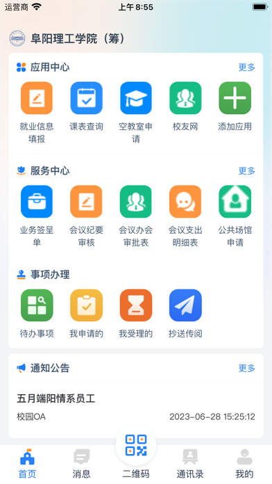 该应用是面向全校教职工及学生打造的一款校园便捷应用软件,提供各项校园应用办理服务。 【主要功能】 1. 服务中心:返校申请、请假申请、延假申请、费用报销审批、差旅费报销审批、固定资产申购、业务签呈申请、出差审批等审批流程。 2. 应用中心:物业报修、掌上OA等应用。 3. 通知公告:校园新闻及通知公告展示,为师生提供快速获取信息的渠道。 4. 综合服务:消息中心、虚拟一卡通、意见反馈、个人二维码。修复了一些已知的问题。