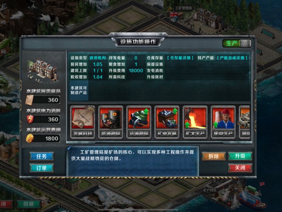 20世纪初,西方世界进入了“大工业”时代,科技在化工、军工、食品、机械等领域都有很大发展。《工业战争》围绕着资源、科技、资本、市场和运输线五大要素,呈现各国的自身建设、殖民掠夺、资本渗透和正面冲突!应用里真实描绘了世界各大城市及周边工矿、农村的经济循环,您可以对自己国家的每一个城市、港口、矿场、军事要塞进行精心布局建设。在电力、资源和生产中充分配合,建设一个屹立不倒的国家,一个强大的经济实体。1. 优化电力供给机制 2. 处理电力不足导致设施不生产的问题 3. 处理城市建筑叠层错误问题