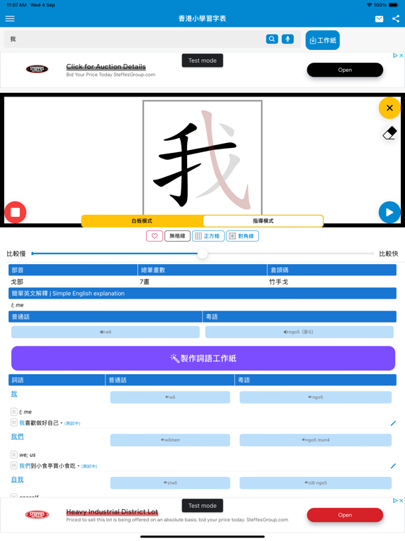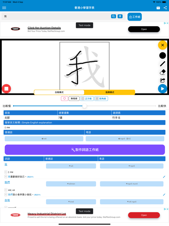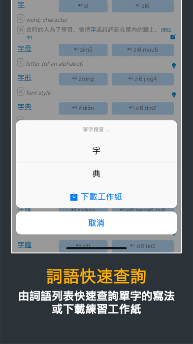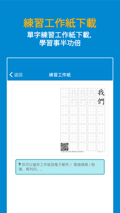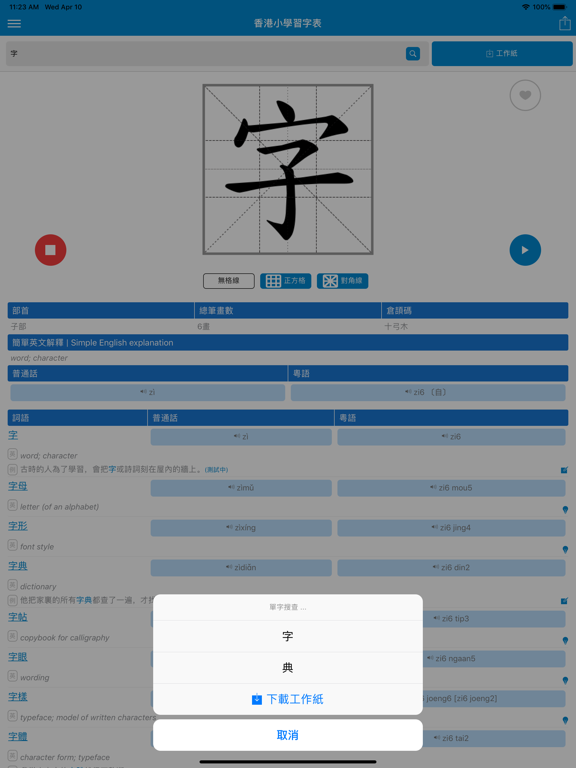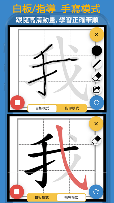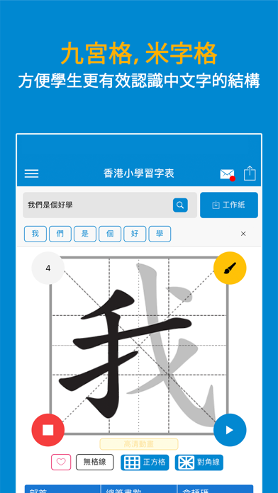 本程式根据教育局《香港小学学习字词表》指引设计,有效帮助小学生认识中文字的正确笔顺。 - 新增写字「指导模式」,即时自动检查笔顺错误,并作出提示。 - 增加了更大更清楚的中文字图像,使用时更加清晰。 - 加入了异体字注解,使用家更了解中文字不同的写法。 - 加入简单英文解释。 - 词语列表快速查询单字的写法。 - 九宫格,米字格可以方便学生更有效认识中文字的结构。 - 快速搜寻中文字的仓颉字码,对中文电脑输入更有帮助。 - 程式全面更新了结构,使用最新的技术以改善流畅度,并修正之前版本的问题。 - 新增单字练习工作纸下载,学习事半功倍。 注:由于教育局最近更新了字库,我们的资料库也更新了。如果你的程式字库未能更新,可能由于电话暂存未能清除之前查阅过的字型。请你尝试于电话内的应用程式设定中,手动清除本程式的数据,以便程式重新下载字库。如果仍然未能够更新字库,请重新安装本程式。 使用条款 (EULA): https://www.apple.com/legal/internet-services/itunes/dev/stdeula/修正程式内潜在的问题