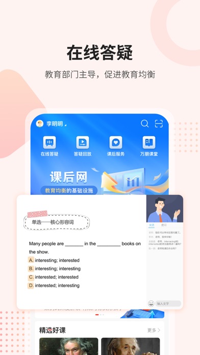 课后网是万朋数智倾力打造的集课后服务、在线课后服务、智慧作业、家校互动为一体的综合性技术平台,助力学校发挥教育主阵地作用,做好五育并举,并为学校和教育局提供一个开放型在线答疑平台。 课后服务版块,是课后4点半学生在校托管服务,帮助学校轻松开展高质量课后服务。 在线课后服务版块,是课后网核心技术支撑的在线答疑平台,配合强大的课堂管理功能,可由教育主管部门主导,组织区域优质教育资源,为家长和学生提供普惠型在线答疑等服务,促进教育均衡发展。 智慧作业,学校对作业进行统一设计,科学管理,在线批阅,作业分析,为减轻学生作业量提供数据依据。 家长通过课后网App可随时随地了解孩子学习状况、成长变化、考勤情况,及时精准接收学校通知,让家校沟通更顺畅,实现高质量家校协同共育。功能优化,提升用户体验。