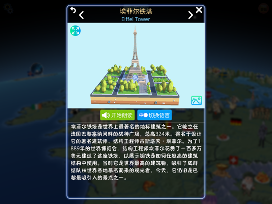 《酷玩地球》是一款由易鹿米科技工作室精心打造的3D地球应用。它将带领您探索世界,了解许多其他国家的趣闻,感受世界各地文化的魅力。相对于从网上获取信息,《酷玩地球》化繁为简,为您过滤掉了海量的垃圾信息,用一小段简洁,精辟的文字介绍当今世界上最有趣,作为高素质人才必须要了解的知识。 官网: scratchlesson.com 官方公众号:蔡老师科技早教 你知道英国斗牛犬的来历吗? 你知道蓝鲸的心脏有多大吗? 能征善战的亚历山大大帝,首创“非暴力不合作”主义的圣雄甘地,这些人类历史上最著名的领袖们背后究竟有着什么动人的故事? 从万里长城到巨石阵,从罗马斗兽场到帕特农神庙,从埃菲尔铁塔到自由女神像,从亚马逊雨林到瓦特纳冰川,从大堡礁到布罗莫火山,我们都将带您领略它们的独特魅力! 不管是国家还是事物的介绍和名称,此应用都提供对应的英文文本,并且配有人工智能朗读功能,让你在了解世界的同时还能学习英语。 此应用中使用的地理数据全部来自于2018年最新的开源地理数据库,并根据这些数据绘制出自己的地图。开发团队还会不断地更新数据,以保证知识的准确性和时效性。同时开发团队还会定期为此应用添加新的功能,扩充内容。我们承诺这个应用将永久不会加入任何形式的广告! 当前版本含有以下内容: - 170多个国家的趣味知识 - 世界各地的美食文化 - 按地域分布的野生动物 - 古代和现代有特色的交通工具 - 历史上最具影响力的人物 - 世界史上的建筑奇迹 - 世界上最著名的自然景观 软件功能: - 旋转和缩放三维地球仪 - 所有内容提供中英对照 - 特色人工智能女声朗读 - 显示和隐藏地球上的国旗,图标 - 点击国家领土可以使其高亮 - 微信分享可以解锁全部国家 - 调节背景音乐和朗读音量修复了一些问题。