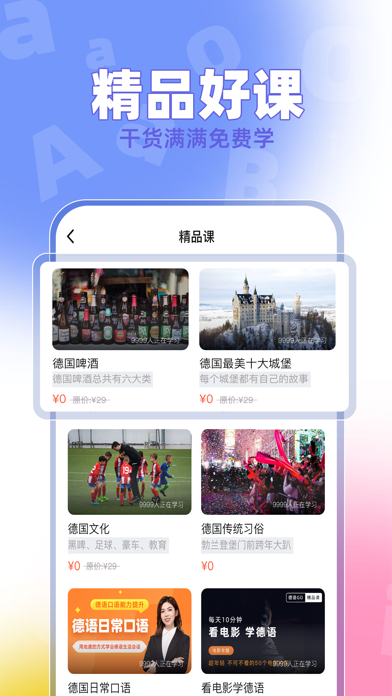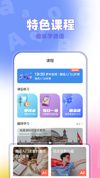 聚趣德语专为德语爱好者量身打造的德语学习助手软件。每个德语初学者的随身德语学习助手,零基础轻松学德语,让其快速入门。 不管是零基础想要系统学习德语、还是有一定德语基础想要巩固学习、还是备考德福歌德考试,都推荐来聚趣德语。 【特色功能】 1. 智能学习系统,优化练习,根据学习习惯生成题型科学算法,为你推荐更适合的学习内容,让你在学德语的过程中开口练习,锻炼流畅发音; 2. 免费领取专属课程,匹配更适合你的德语课程; 3. 趣味德语精品课,让你学语言的同时了解多元的德语文化; 4. 德语每日一句,真人朗读讲解,每天进步一点; 5. 海外留学名师,多年教学经验,100%国内名校毕业辅导老师课后辅导,课后难题全解答。修复已知问题,提升用户体验