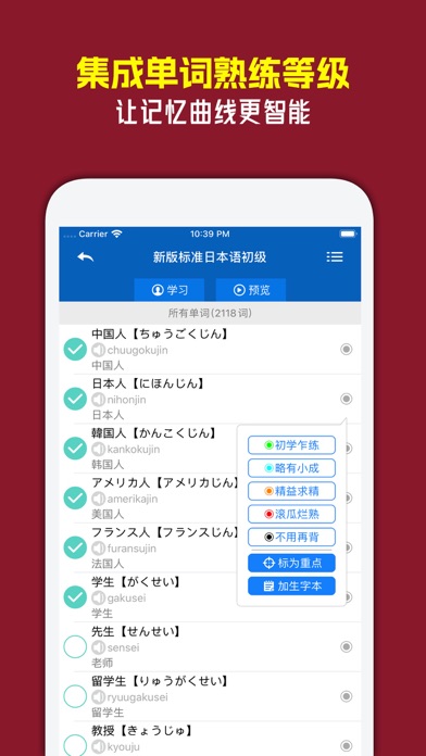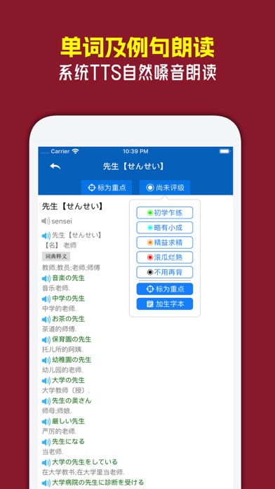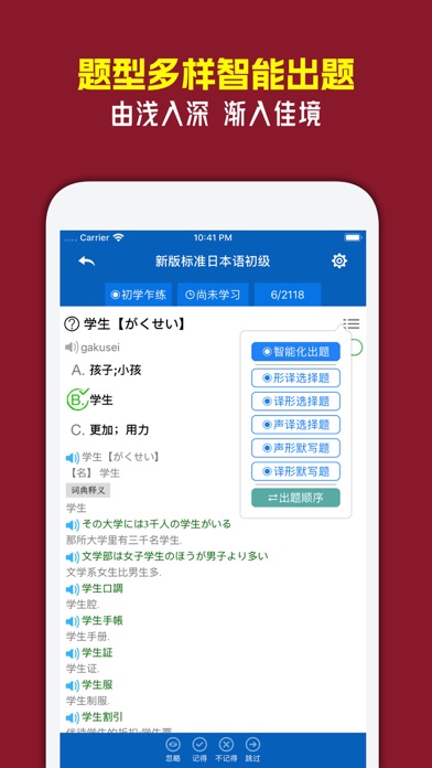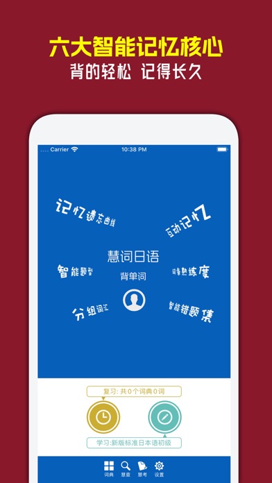 慧词日语背单词,独有六大智能记忆核心,词汇丰富,操作简单,让您背的轻松,记的长久。 软件特色: 1、智能记忆核心一:基于艾宾浩斯记忆遗忘曲线,独有智能调整技术 2、智能记忆核心二:互动记忆,简单而高效 3、智能记忆核心三:单词标记熟练等级,区分不同难度单词 4、智能记忆核心四:题型多样,难度各异,智能出题 5、智能记忆核心五:分组词汇,实时统计;有针对性巩固所学,即时了解学习情况 6、智能记忆核心六:智能错题集,即时巩固易错、难点词汇 7、词汇丰富:多种常用教材单词、实用词汇、JLPT日语能力考试词汇等 8、真人语音和TTS朗读二种朗读方式 9、大量日语单词例句,并支持TTS朗读 10、日汉查词典 11、试卷考试系统 12、单词批量预览 13、生字本 14、其它 详细介绍: 1、智能记忆核心一:基于艾宾浩斯记忆遗忘曲线,独有智能调整技术   艾宾浩斯记忆遗忘曲线将为每个单词记录练习时间,并根据遗忘规律为其制定合适的复习时间表,通过在人脑记忆黄金序列时间点进行循环复习巩固,循序渐进提升对单词的长期记忆效果。独有的智能调整技术,根据您的学习情况或习惯,智能修正计划时间表,即使您经常未能按照计划完成学复习,也不影响学习效果。在实际使用时,您并不需要关心它是如何工作的,软件会全自动管理什么时候背哪些单词、复习哪些单词,为您自动分配好学习计划。您只需要在软件提醒您复习时点击复习按钮完成复习即可。 2、智能记忆核心二:互动记忆,简单而高效   互动式学习方式,操作简单,节奏快效率高,轻松但不枯燥。背单词的过程,本质上可归结为您对单词的掌握评价。在互动学习过程中,您可以选择答题(选择题或默写题)从而由慧词来判定您对单词的掌握程度,也可以直接对单词进行掌握评价(如:记得、不记得、记对、记错等)。 3、智能记忆核心三:单词标记熟练等级,区分不同难度单词   每个单词均会被标记上熟练等级以反映您对它的掌握程度。根据掌握程度,熟练等级可分为:初学乍练、略有小成、精益求精、滚瓜烂熟、不用再背。在互动学习时,单词的熟练等级会根据您对它的学习情况(如练习时是否答对题、对单词进行怎样的掌握评价等)而有变化,这种变化将实时反映您对它的掌握情况,或单词对您而言的难度等级。 4、智能记忆核心四:题型多样,难度各异,智能出题   互动学习中,支持选择题和默写题二大类题型。选择题型包括:形译选择题、译形选择题、声译选择题;默写题型包括:声形默写题、译形默写题。不同的题型难度是不同的,比如默写题普遍要难于选择题,再比如译形选择题通常难于形译选择题等。默认情况下,慧词会根据您对当前单词的掌握程度,出与之相匹配的难度的题型。当然,您可以自由设置题型来强制进行某种题型的练习。 5、智能记忆核心五:分组词汇,实时统计;有针对性巩固所学,即时了解学习情况   所有词汇可以根据熟练等级进行分组和统计,也可以按照学复习情况进行分组和统计,还可以按照课程进行分组和统计。分组后可以更有针对性的巩固学习,比如对于掌握程度较低的单词可以进行专门巩固;当天复习了的或学习过的单词可以抽时间再来一次巩固;而如果您要进行课程同步学习,就可以根据课第分组来巩固对应课第的单词。分组另一个功能是统计功能,分组统计便于您了解自己对各个分组的掌握情况。 6、智能记忆核心六:智能错题集,即时巩固易错、难点词汇   在练习过程中,慧词会自动收集您做错的题,并在练习中适时地进行错题重出,对这些易错的、难点词汇进行多重加强和巩固练习。 7、词汇丰富:多种常用教材单词、实用词汇、JLPT日语能力考试词汇等   慧词日语目前收录了包括《标准日本语》、《新版标准日本语》、《大家的日本语》、《新编日语》、《实用词汇》、《走遍日本》、最新JLPT N5/N4/N3/N2/N1考试等词汇。 8、真人语音和TTS朗读二种朗读方式   单词采用真人朗读,帮助您记忆单词的同时,纠正口语发音和提高听力水平。同时,单词也支持基于Text-to-Speech技术的朗读,您可以在设置界面选择朗读方式。 9、大量日语单词例句,并支持TTS朗读   绝大部分单词都配备大量例句,且支持基于Text-to-Speech技术的朗读,在软件中点击例句即可朗读。对于TTS,您可以通过安装优质的TTS日语噪音来提高朗读效果,方法是通过系统【设置-通用-辅助功能-语音-语音】来下载和安装(安装完成后需要重启本应用);TTS朗读支持朗读速度的调节(可以在设置中调节),通过快慢速的朗读可以更好的提升听说的能力。 10、日汉查词典   内置日汉词典(单向词典),您可以将查询到的单词加入生字本后进行学习。 11、试卷考试系统   学习一段时间后就可以对自己的学习情况进行考试自测。试卷系统支持智能题型或自由设定考试题型,支持考试范围设定等。 12、单词批量预览   您可以通过自动预览功能对课程单词进行预览,预览功能可作为课程预习或快速复习工具。 13、生字本   浏览课程单词或查词典后,可以将单词加入生字本进行专门学习,生字本作为特殊的词典允许对它添加、删除单词。 14、其它   慧词为日语单词自动标注罗马字;练习支持顺序或智能随机出题;单词默写支持及时判断(即默写时输入错误立即提醒,可以在设置中关闭);可以将重点单词标记为『重点词汇』再进行统一练习等。+ 修复和优化