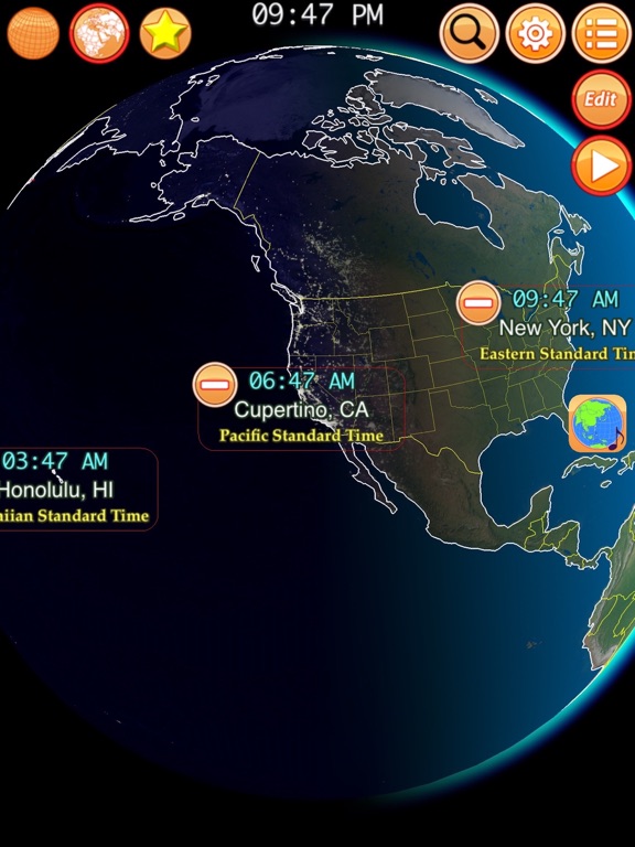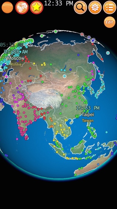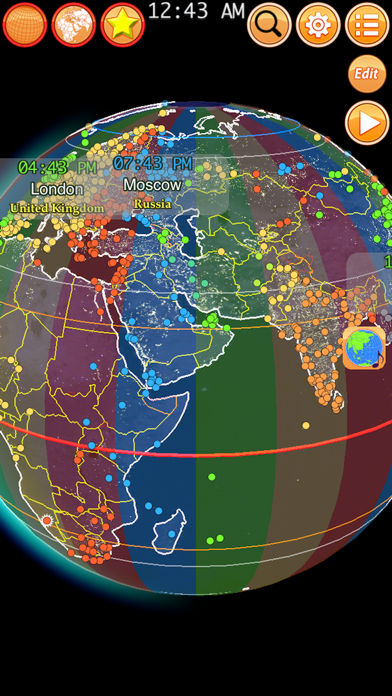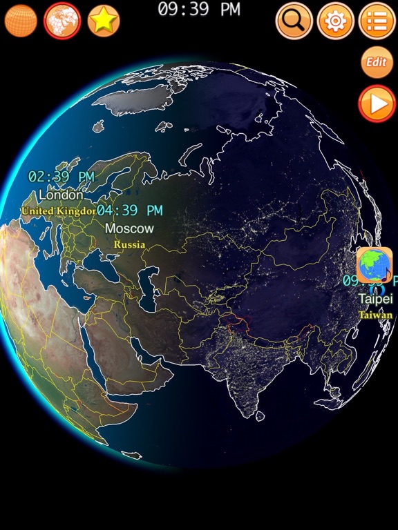 现在几点呢? 全球的城市因为太阳照射的差异而有不同的时区. 当纽约是白天的时候, 北京却是晚上. 这个 app 将完整的呈现世界各地的时间, 使用日光节约时间的城市也会正确地显示. ---------------- ◉ 特色 ◉ ◎ 即时混合白天和夜晚的地球仪 ◎ 包含 1300+ 个城市 ◎ 城市时区以特定的颜色区别 ◎ 支援日光节约时间 (DST) ◎ 可标记数个喜爱的城市 ◎ 支援 12/24 时制 ◎ 国界与海岸线 (包含争议地区) ◎ 经纬度资讯 (赤道, 北回归线, 南回归线, 北极圈, 南极圈) ◎ 直觉的手势操作 ◎ 搜寻城市名称 ◎ 显示你的所在位置 ◎ 无需网路连线即可使用 ◎ 内建付费购买机制: 移除广告 ---------------- ◉ 手势操作 ◉ ◎ 轻点击: 将点击点转至正中央 ◎ 双点击: 增加/减少喜爱的城市 ◎ 两指手势: 缩放, 转动地球 ◎ 滑动手势: 动态转动视角 ---------------- ◉ Special Thanks ◉ ◎ Naaty Design, http://www.content-pack.com ◎ Visible Earth, http://visibleearth.nasa.gov ◎ Natural Earth, http://www.naturalearthdata.com ◎ Tom Patterson, www.shadedrelief.com ----------------优化直式画面, 修正萤幕转向问题
