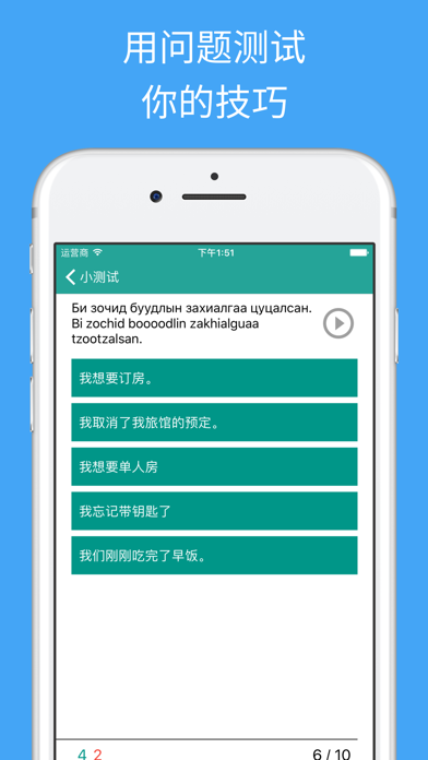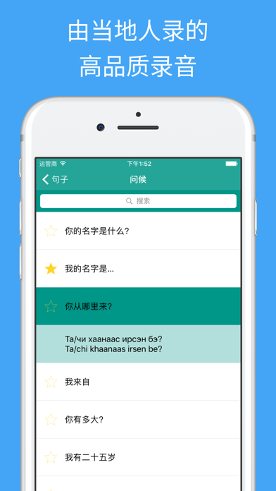 ***边游蒙古边学蒙*** 轻松学蒙手册是一个免费的蒙应用,能够使你快速的简单的学习蒙。 所有蒙短语和单词呈现给你两个语音和原有的蒙写作。由蒙古当地女孩录制 保存你最喜欢的短语和单词并顺利复习他们。 使用间隔复习的技巧与卡片来学习你的词汇。 用有趣的蒙问题来测试你的知识并复习你的成绩。 ***在周游蒙古时生存*** 蒙古使用蒙手册来生存。所有重要的生存短语都包含在内。 例如,使用应用告诉出租车司机你要去哪里。 搜索所有的短语和单词,快速访问你所需要的部分。 ***主要特点*** * 300+个免费的短语和字 * 蒙古当地女孩录音 * 高品质音频 * 间隔重复学习系统 * 测试来复习你的技能 * 追踪你的学习进程 * 保存你最喜欢的短语和字 * 快速查找功能 * 复制短语到剪贴板(通过长按短语) * 能减慢语音播放速度 * 调整小测试和卡片的设置 蒙->汉语,汉语->蒙,发音->汉语,汉语->发音 ***学习类别*** 11个免费学习类别. 在以下类别中学习300+免费的蒙短语蒙语字词: * 蒙基础对话 * 蒙问候 * 方向和地点的句子 * 方向和地点的短语 * 住宿 * 在蒙古外出就餐 * 在蒙古购物 * 在蒙古观光 * 紧急情况 * 时间和日期 * 蒙数字 22类专业版. 用以下附加的类别在专业版中学习所有 1000+蒙短语和字词: * 高级的会话 * 健康 * 过境 * 问题 * 地点 * 食物 * 蔬菜 * 水果 * 颜色 * 浪漫史 I * 浪漫史 II * 邮局 * 电话&网络 * 银行 * 职业 * 商务会谈 * 兴趣 * 感受 * 身体 * 动物 * 国家 * 家庭 ***反馈赞赏*** 如果你喜欢这个应用程序,请用几秒钟给一个评价或评论。如果你有任何意见,建议或劝告请联系我们:support@simyasolutions.com。 ***关于我们*** 网址:simplylearnlanguages.com/mongolian 请联系: facebook.com/simplylearnlanguages 愉快的学习蒙! Apple 已更新此 App 以显示 Apple Watch App 图标。