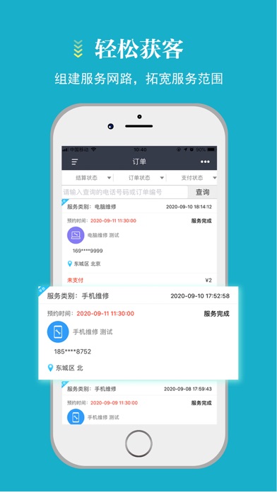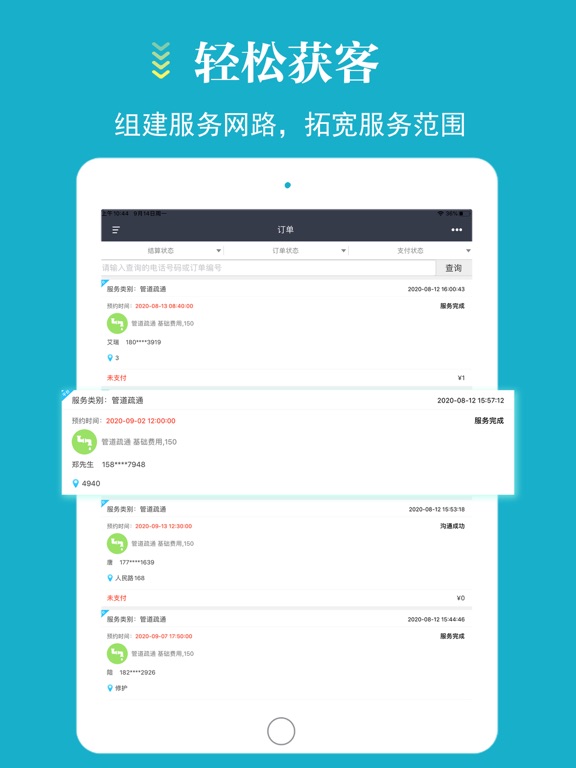 蓄客多打造一站式商家接单、获客、用户管理服务平台。利用信息技术助力商家组建服务网络,拓宽服务范围,轻松获客,海量订单接不停。并为商户提供高质量的客户管理服务功能,是商户实现接单需求的必备工具,提高商户和客户之间的沟通频率,提高接单和服务效率。 【蓄客多】助力,让您随时随地接订单,轻松松松赚钱。 【接单赚钱】 海量订单:蓄客多几乎涵盖了生活服务类所有用户需求,海量订单接不停。 随时分配:让您随时随地都可以对订单情况进行改查。 跟踪查询:实时跟踪订单完成进度。 一键沟通:快速与用户取得联系,实现有效沟通,管理订单更高效。 【轻松获客】 服务网路:蓄客多可以帮助你组建自己的服务网络体系,搭建专属你的小程序、公众号等。 精准线索:根据技能匹配相应的服务线索,一键抢单,直接跟用户沟通达成交易。 快速指派:系统派单,精准快速,及时处理异常单和滞留单,提高实践利用率。 【智能管理】 收益管理:每完成一单,收益即刻入账,随时查看个人收益情况。 订单管理:快速创建订单,统计订单完成情况。售后订单实时查看,及时处理不遗漏。 客户管理:客户满意度调查,可以创建客户优惠券,折扣券等优惠项目。 评论管理:用户评论数据汇总,好评差评分类,及时了解客户反馈。修改了高版本系统下无法拨打电话的BUG