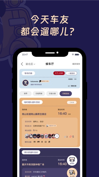 飞克比托(重庆)数据科技有限公司成立于2022年5月25日,专注于开发精准细分领域的APP。公司于2023年6月推出一款专注摩托车行业的骑行APP——遛遛摩托。遛遛摩托APP倡导安全文明骑行、“不炫技、不攀比、遛到老”,致力于打造一个"骑行信息共享智能平台",通过信息共享为车友提供全方位的便利,营造更好的骑行氛围,最终愿景是“用科技赋能骑行生活”。 "骑行板块"通过提供电子免责协议和意外保险服务,确保车友骑行安全与权益保障;"遛遛板块"聚集超过300个城市的4000个机车打卡点,便于本地车友和异地摩旅的车友查询;"降雨云图"利用气象数据提供分钟级降雨云图,辅助车友规划安全出行。修复已知bug 优化用户体验