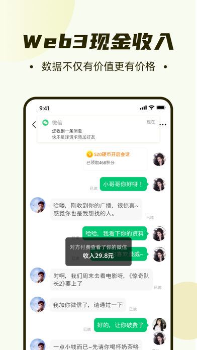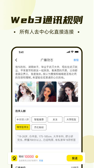 用户数据是信息社会最重要的生产资料,无数种商业场景,比如广告、交友、招聘等,都依赖用户数据完成连接和交易。长期以来,用户本人从未掌握过自己的数据,反而是互联网平台从我们的数据中攫取了巨额利益。 如尔团队坚定支持Web3愿景,即用户应该可以管理自己在平台存储的数据,数据只有经用户授权,才能被第三方使用,更重要的,只有用户本人有资格为自己的数据定价,并获得收益。 因此,我们开发了如尔App,这是一款底层逻辑创新的通讯应用。我们提供一个基于区块链的数据库,由用户上传并认证信息,然后将不同的数据授权到不同的身份,应用于不同的商业场景。每个身份都有唯一的身份地址,每个人都能自由检索数据,找到需求的彼此,并按照对方预设的价格,点对点直接连接,从而实现去中心化的信息分发。 需要特别说明的是,Web3带给用户的,绝不是眼前的一点现金收益,而是生产关系革命后,生产力的飞升——具体到互联网,就是连接将更加低成本、高效率。当每个人都能平等的使用所有人的数据,就像被赋予上帝视角,将开启一场新的信息革命。 -----联系我们----- -身份地址:role.cn/pi -邮件联系:kf@ghcx.ltd1.修复已知问题 2.优化用户体验