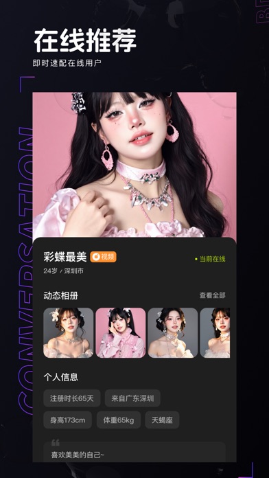 彩蝶APP是一款专为CDTS女装大佬等跨性别人士打造的社交乐园 我们的初心,是打造一个开放、平等、充满包容与爱的平台,让每一位用户都能在这里自由地追求属于自己的美好生活。在这里,你无需担心外界异样的目光,可以尽情地展现自我,释放你的魅力,与志同道合的朋友们相遇,共同分享快乐与成长。我们非常期待你的加入! 应用特色: 1、兴趣交友 CD/TS/伪娘交友平台,资深女装大佬在线交流 2、极速畅聊 滑卡极速匹配圈内玩家,1秒立刻闪聊尽情交流 3、精彩视频 精彩视频展示变装美貌,一键搭讪与TA开启邂逅 4、圈内社区 社区内容丰富多彩,大佬频现分享经验1、优化APP整体性能体验 2、修复若干用户反馈Bugs