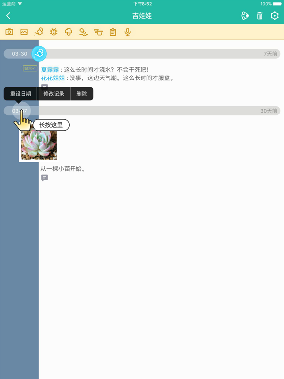 帮助您更加简便的记录多肉植物的成长过程,留下精彩的成长痕迹。 记录以及提醒您浇水,杀虫,施肥的时间。 当肉肉小有所成时,向您的朋友分享这一历程~ 如果有问题可以在App Store发表评论,24小时后会收到我们的回复。 操作提示: 1.修改记录: ●修改或删除某日记录,只需长按记录的“日期”,在弹出的菜单中可以选择编辑、重设日期或删除当日记录。 ●如果前几天忘记更新记录,可以新加一条记录,长按“日期”选择重设日期,可以将记录日期重新设定为5天之内。 2.旧照片转换成记录: ●在创建肉肉时,选择从多张照片中提取记录。通过“修改记录”按钮可以重新设置记录的日期;自由编辑记录。 3.查看大图时,左右滑动查看同一天的多张图片,上下滑动查看前后日期的图片。 4.肉肉默认的颜色为“出状态时的颜色”。没有达到的朋友继续努力。在以后的版本中,也会由您来设置她的颜色。1.修复适配iOS18出现的Bug。