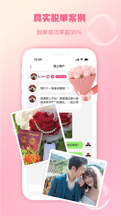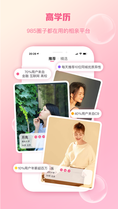 源自清华、985圈子都在用的相亲交友平台。专注于服务高学历优秀青年,通过严格资料审核认证、精准定位用户群体,提供真实&优质&高效的脱单恋爱服务,致力于为不愿将就的你,找到最好的爱情。 平台特色 【优质用户】73%用户来自985和海外名校,40%用户来自C9;70%用户来自金融、互联网、高校,10%用户年薪超百万。 【安全靠谱】身份/学历/真人认证三项认证,严格信息审核,增加信任背书。 【女性友好】主创团队均为女性且通过平台脱单,设身处地为用户着想 【五星级用户体验】产品覆盖线上交友+线下活动+精准匹配+恋爱学堂,全方位满足用户不同需求,工作人员全部高学历,提供有温度的服务 产品介绍 【每日精准推荐】每天推荐10位同城优质异性,所有推荐用户都完成三项认证且资料详细 【交友活动报名】 7大城市,每周举办2-3次交友活动,八分钟约会&精品饭否&桌游剧本杀&羽毛球&飞盘&徒步&射箭 【红娘精准匹配】资深红娘全程保驾护航,从筛选到沟通到约见,全方位恋商提升及复盘总结 【恋爱学堂】科学靠谱的脱单方法论,直面恋爱困惑,修炼亲密关系 如你有意见建议,欢迎联系我们:微信公众号【陌上花开HIMMR】 如果你喜欢我们,别忘了给我们打分评论哦~修复已知问题,优化产品体验