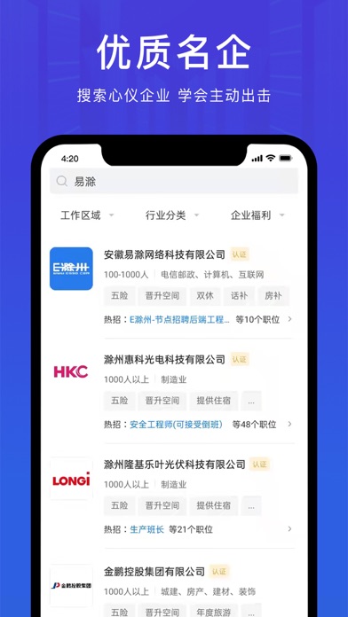 滁州招聘、找工作,就看E滁州招聘网! E滁州招聘网是安徽易滁网络科技有限公司旗下招聘网站,致力于为求职者提供滁州本地优质招聘信息、为企业提供招聘渠道,帮助每一个求职者在E滁州招聘网找到合适的工作! E滁州招聘网,搜索好工作!1.修复部分职位详情的地址展示问题。