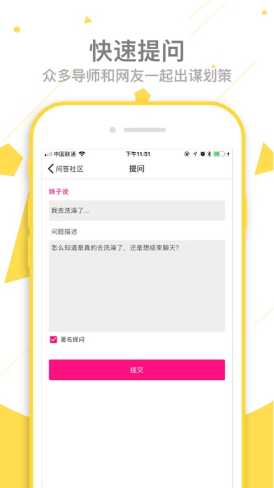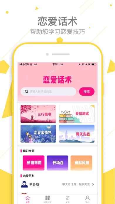 谈恋爱最重要的是谈,可是谈的时候我们会遇到各种各样的问题: 和女生聊天没有话题? 不知道怎么逗乐女生? 女生生气了不会哄? 不知道怎么让女生愿意跟你聊下去? 不知道女生对你有没有意思? 恋爱话术,一款可以帮你解决以上烦恼的App,10W+话术库,遇到不知道怎么回复女生时,来这里搜一下,N+精彩回复供您选择,帮助您更好的谈恋爱,更有问答社区和网友们共同交流。 【核心功能】 1. 10W+话术供您搜索,遇到不知道怎么回复妹子时,来App搜一下,N+精彩回复拉近跟妹子的距离; 2. 问答社区,有问题可以在问答社区提问,众多导师和网页为您解答; 3.恋爱表情包,表情包很多,套路也很多; 4.三行情书,让爱情充满浪漫的感觉; 【产品特点】 1. 内容丰富,海量的话术供您搜索,帮助解决聊天中各种实际问题; 2. 问答社区提供交流平台,聚焦恋爱聊天技巧,跟有经验的人一同探讨; 3. 支持匿名提问,保护用户隐私。1. 修复已知问题 2. 优化使用体验