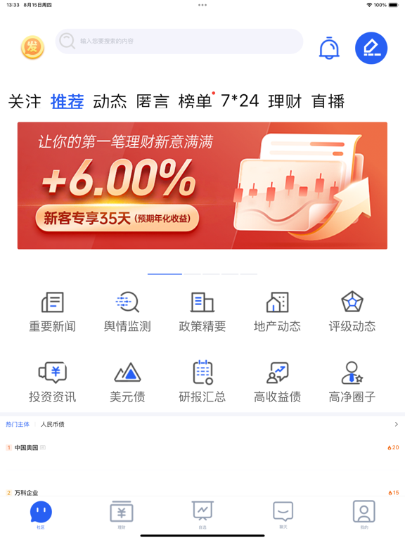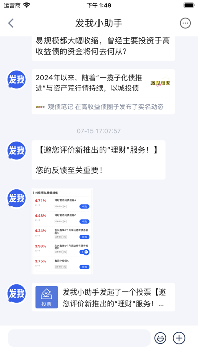 发我,精耕于高收益债投资社区,聚集了国内对高收益债投资感兴趣、有见解、接纳度普遍较高的人群。旗下投研团队精选固收领域优秀金融产品,为高净值客户在债券领域的投资提供专业化一站式服务。 我们给用户提供的价值 【独家】发我独家高收益债第一手舆情、精选投资资讯服务。 【特色】投资交流平台——实时债圈热点、大V观点、投资趋势。 【行情】高收益债市场行情及信息,为投资者配置债券型资产提供有效消息与决策参考。 【投研】山西证券专业投研团队入驻,帮你发现投资好机会。1、新增热议话题页面 2、新增机构业务介绍页 3、优化了一些已知问题
