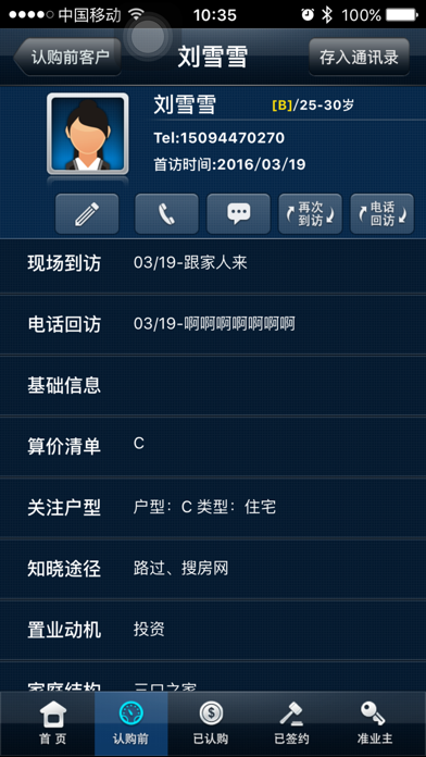 移动互联时代的房地产案场客户管理系统。置业顾问通过手机端可实现对客户全流程的便捷管理,并通过网络平台共享,开发商亦在管理后台即可实现对客户管理的深度把握,精细化的案场管理,全流程的过程掌控。1.优化用户体验;