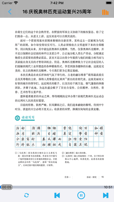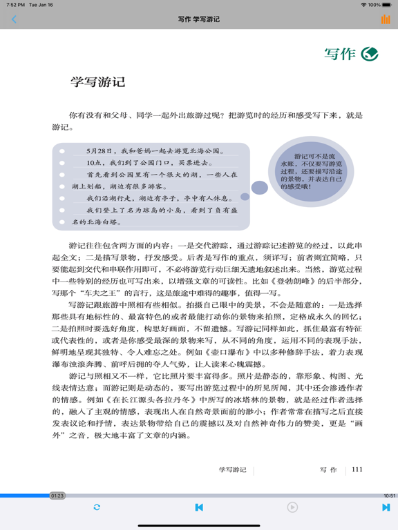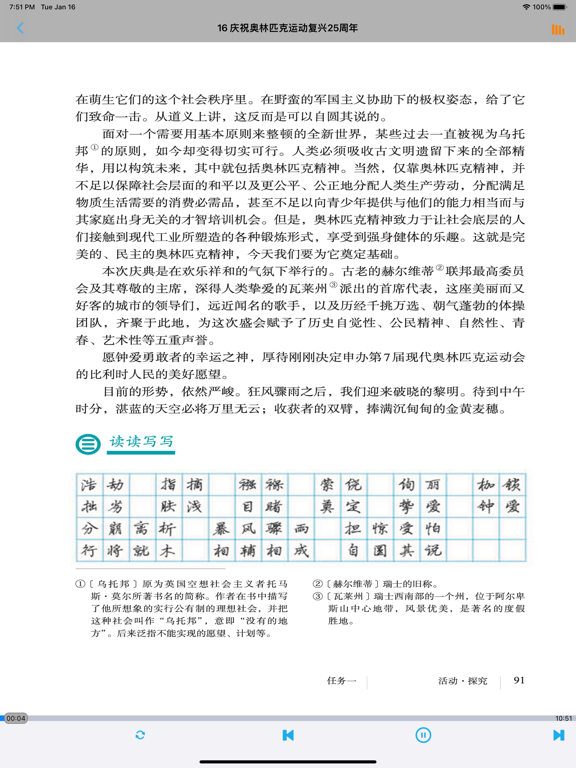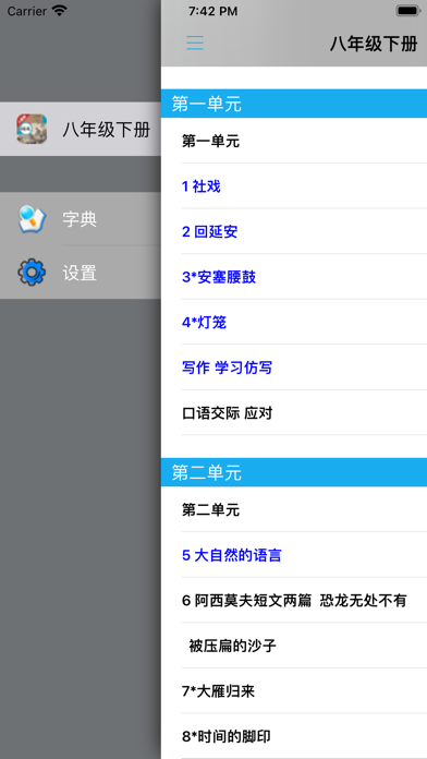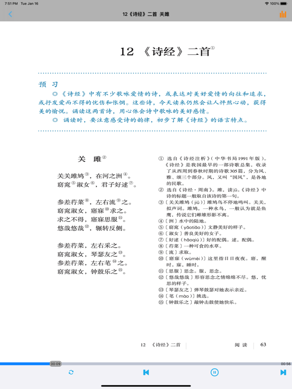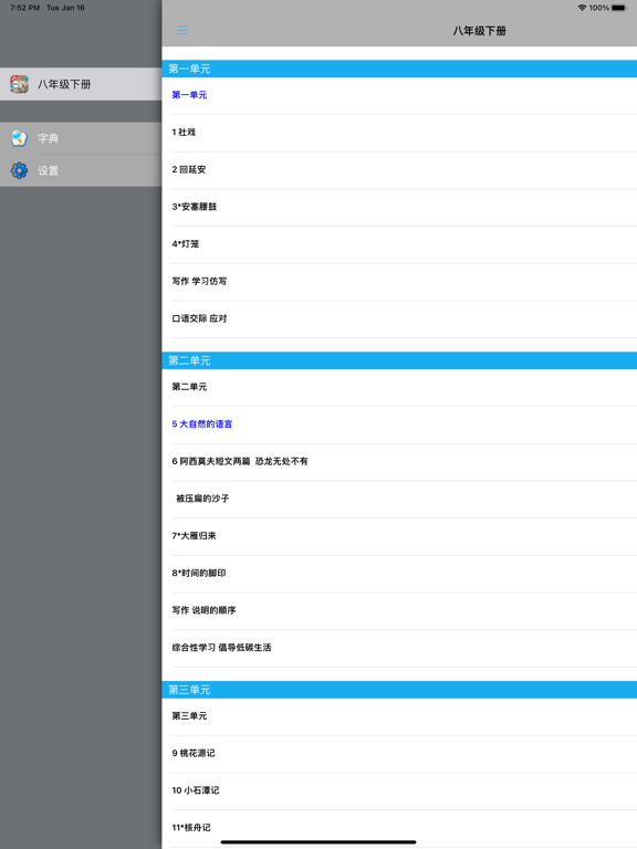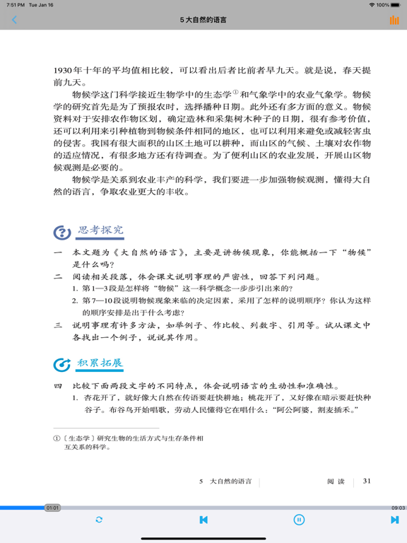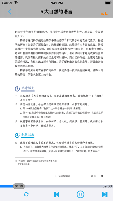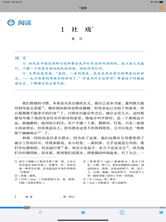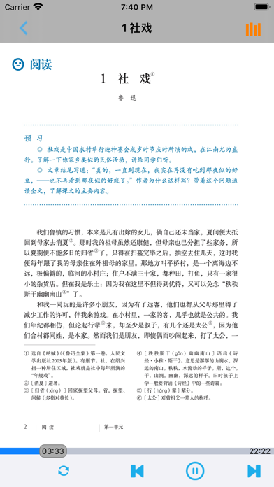 不单单是复读,【E-Learning】应用系列让您的iPad和iPhone变成学习机! 学生通过它随时随地完成课前预习、课后复习,学习能力更胜一筹! ***** 完全匹配教材,操作简便,哪里不会点哪里 ***** *根据教材配套,此应用为人教版初中语文八年级下册(部编版)2016年最新课本内容。 *涵盖教材全部内容,让您全面掌握拼音字母、生字、词语、句子、课文、故事、诗歌等课程内容。 *全套原版录音和教材完全同步,助您成为中文大明星。 *操作简便、携带方便,从此抛弃磁带和光盘。 【E-Learning】应用系列同步教材制作,内容完全一致,您可以使用它来进行课文学习,播放教材配套音频,配乐读音准确清晰,寓教于乐,让学习更高效和有趣! 此应用将成为孩子自学的专属外教,把家长从繁琐的辅导解答中解放出来!能点、能读、更能说,是学生的好老师、好家长! So easy!妈妈再也不用担心我的学习了,哪里不会点哪里! 功能特色 - 配乐读音准确清晰,怡情养性,陶冶情操。 - 内容与录音质量放心,语音纯正、朗诵有配乐。 - 语音播放灵活,快速翻页,目录跳转。 - 任意位置即点即学,复读模仿随时随地。 - 完全同步教材制作,内容完全一致。 - 支持后台播放,锁屏状态可随身听读。 - 界面简单大方,意图明了,功能实用,操作方便。 —【E-Learning】应用系列 — 适用于多种教学场景,您可以更加便捷地进行碎片化学习,期待您的使用! 致力于为中国K12教育提供最优秀的互联网教育应用软件! E-Learning乐园,伴随青少年健康快乐的成长! *****软件功能***** 1.通用应用,同时支持iPhone,iPod touch,iPad设备 2.可以自动顺序播放功能 3.可以自动记录播放位置,不用担心下次找不到听到哪 4.支持离线播放,即使不联网也一样听,到哪都不怕 5.支持手动拖拽前进、后退播放 6.在兼顾软件容量以及更多课程的情况下,我们最大限度保证音频的高质量,每个有声读物片段都是经过我们精选和亲测 7.最最重要的功能,可以拖动字幕定位,音频随之定位 本应用与《义务教育教科书人教版初中语文八年级下册》(部编版)2016年最新课本同步 最新版(八年级下册)目录: 第一单元   1 社戏   2 回延安   3*安塞腰鼓   4*灯笼   写作 学习仿写   口语交际 应对 第二单元   5 大自然的语言   6 阿西莫夫短文两篇   恐龙无处不有   被压扁的沙子   7*大雁归来   8*时间的脚印   写作 说明的顺序   综合性学习 倡导低碳生活 第三单元   9 桃花源记   10 小石潭记   11*核舟记   12《诗经》二首   关雎   蒹葭   写作 学写读后感   综合性学习 古诗苑漫步   名著导读 《傅雷家书》:选择性阅读   课外古诗词诵读   式微/子衿   送杜少府之任蜀州/望洞庭湖赠张丞相 第四单元   任务一 学习演讲词   13 最后一次讲演   14 应有格物致知精神   15 我一生中的重要抉择   16 庆祝奥林匹克运动复兴25周年   任务二 撰写演讲稿   任务三 举办演讲比赛 第五单元   17 壶口瀑布   18 在长江源头各拉丹冬   19*登勃朗峰   20*一滴水经过丽江   写作 学写游记   口语交际 即席讲话 第六单元   21 《庄子》二则   北冥有鱼   庄子与惠子游于濠梁之上   22 《礼记》二则   虽有嘉肴/大道之行也   23* 马说   24 唐诗三首   石壕吏   茅屋为秋风所破歌   卖炭翁   写作 学写故事   综合性学习 以和为贵   名著导读 《钢铁是怎样炼成的》:摘抄和做笔记   课外古诗词诵读   题破山寺后禅院/送友人   卜算子•黄州定慧院寓居作/卜算子•咏梅- 内容更新为2016年最新课本内容; - 图片全为高清图片; - 适配各机型屏幕; - 修改已知问题; - 优化系统。