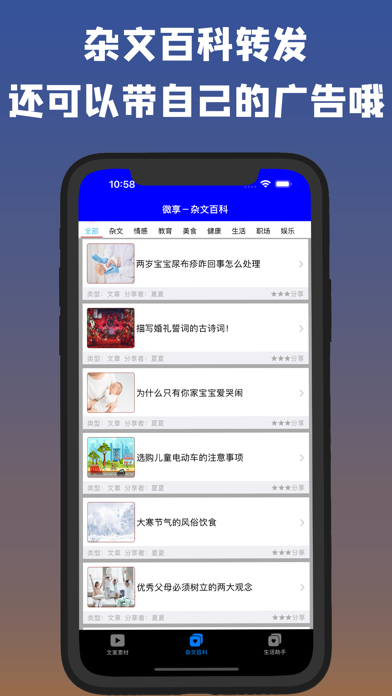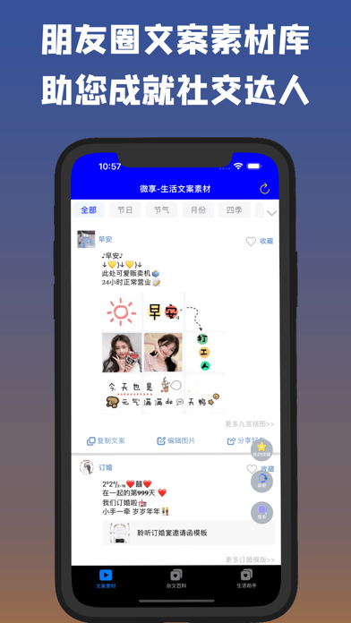 微享-小分享,大传播,分享生活,分享人生,文案素材库,文案生成器,朋友圈文案自动生成,朋友圈素材丰富多样,完全满足您的日常生活的朋友圈分享所需,配图海报自由设计制作,分享社交朋友圈文案、朋友圈转发、朋友圈海报图片,祝福语大全,生日祝福、节日祝福等,收集丰富的名言佳句,励志语录,各类生活社交所需的文案,一款真正的文案生成器,自动配图海报编辑器,朋友圈请柬、朋友圈贺卡、朋友圈相册,生日、节日、升学、新年等祝福,收集分享您所喜欢的句子,名言,短名,名录,温暖治愈的文字,有趣搞怪的符号图形,emo文案,emoji符文,表情包,表情符号,同时提供朋友圈文案所需要配的海报、图片、拼图及日常生活所需的各类微信邀请函、贺卡、相册、九宫格图,照片编辑处理,长图拼接,照片组合,照片海报制作,微视频、短视频已成生活中经常碰到的问题,协助您制作、发布属于自己的各类朋友圈文案,朋友圈海报图片,朋友圈九宫格拼图等,朋友圈微短视频制作发朋友圈或是其它社交媒体等,这些现如今必备的各类操作与功能,通过微享为您提供一站式的服务,是很好的生活助手 ,同时转发小视频,生动文案、海报图片自动整合内容,助您立于移动互联网时代的前沿,一键分享微信、微博,微信,微享是您移动互联网时代的所需要的必备工具,如果你同时是一个微商或是中小企业主,则微享更是您所需要的软件之一,可以满足您多种生活与工作中各类功能所需,可以帮你快速寻找到适合的朋友圈文案,制作各类邀请函、贺卡、海报图片,微视频等。 我们是一款收集整理文案,佳句,名言,祝福短信,微信祝福语等,自动智能文案配图,累计几十万条经典朋友圈素材足以满足你的发圈需求,同时提供制作朋友圈图片,制作朋友圈视频,制作朋友圈海报,制作朋友圈贺卡、制作朋友圈邀请函,制作朋友圈相册,制作各类朋友圈素材,快速匹配文案内容,一键转发分享,助您成为移动互联网时代的社交达人,图片与小视频的制作能手,傻瓜式简单易用,即用即会的生活助手软件。 各类朋友圈素材制作与分享及传播是软件目前的一大热点,将带有你自己个性化的文案及相关配图,智能配图、图片、海报、视频等分享到朋友圈等任意社交媒体,帮助曝光。用微享,每天获得成百上千次的曝光机会,完全免费。更可以参加广告交换等,让别人帮你转发瞬间在朋友圈获得大量的传播推广机会,可以指定地区传播,瞬间在某个地区引曝你的内容,获取大量的推广。 对于社交营销,直接在朋友圈发广告的传播行态目前需要改变 了,新的传播方式使用微享利用小视频,图片海报,文案等的本身传播属性帮你快速传播,微信分享。一句话,适用于所有有个性化社交朋友圈发内容打造自我品牌,自我形象需求的广告主,个人,企业等。 微享会员【自动续费会员说明】 1、 订阅周期:1年(连续包年产品), 每年98元。 2、 付款:用户确认购买并付款后记入iTunes账户, 如需取消续订,请在当前订阅周期到期前24小时以前,手动在iTunes/Apple ID设置管理中关闭自动续订功能。 3、 续订:会员的自有充值账户或苹果iTunes账户会在到期前24小时内扣费,扣费成功后订阅周期顺延一年。 4、免费试用不适用于已获取过免费试用和现有的已经订阅会员的用户。在购买订阅时,免费试用期的任何未被使用部分将失效。 5、隐私政策:http://www.wyxokokok.com/payment/inpaylist/02.html 6、自动续费会员服务协议:http://www.wyxokokok.com/payment/inpaylist/03.html,微商营销,个人销售营销等,利用微信等社交平台做推广营销的新时代到来,紧跟时代主流,快速建立依托与微信,微博等属于自己的传播渠道是新时代广告必须要做的。我们将一如即往,专业敬业,所以更好,为您提供营销推广软件与服务。添加文案素材,丰富内容,修改发现的问题。