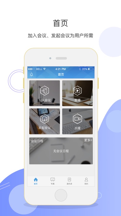 内容提要 这是一款互联网音视频通讯APP,主要通过加入会议的功能入会,满足用户随时随地进行视频通讯的需求,真正实现多人面对面视频沟通,可广泛应用于工作生活中。 主要功能 【首页】包含加入会议、发起会议、直播、点播、会议日程功能。 【加入会议】直接输入会议号、密码即可入会。 【视频通讯】高清视频效果,真正实现面对面无障碍沟通。 【会中控制】可进行开启/关闭语音、开启/关闭摄像头、切换前后置摄像头、在通讯中共享图片、静音、挂断等操作。1. 添加香港手机号注册功能 2. 提升用户使用体验,优化性能