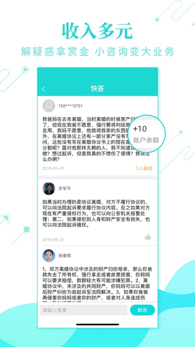 火爆全国的职业崛起加速器 实现律师、翻译、财务的收入最大化 【100+】平均每年多承接100+高质量业务 【30%】至少节约30%的办公时间 【1000+】结识法律、翻译、财务等各领域精英1000+人 【12种】专业付出有偿回报,12种赚钱模式任君选 【0元】免费入驻,不收年费 如有意见和建议,欢迎联系官方微信客服:szrw201715Bug修正。优化体验。