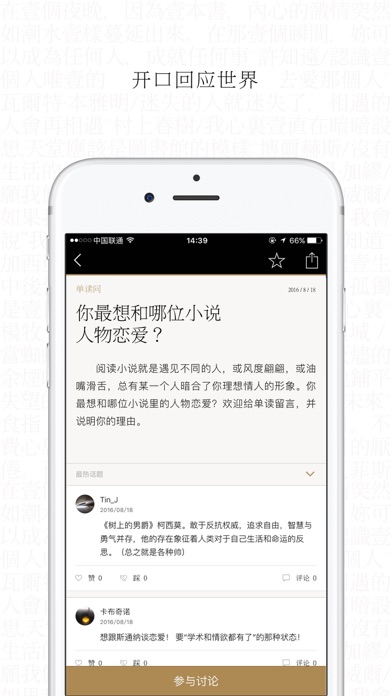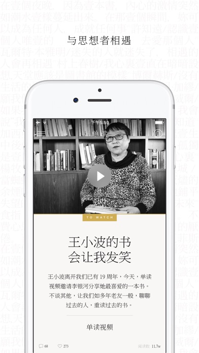 我们无法界定这个时代是好是坏,因为我们仍身处其中。 单读愿意一直探寻,发现这一代人中的鲁迅、加缪、海明威,用每一个独立灵魂的故事建立起属于我们自己的黄金时代。 在碎片化的时代,我们依然热爱沉静的阅读,透过严肃的内容,聆听这个世界上最清醒的声音。 单读反对碎片化的阅读方式,用深度的内容去对抗浮躁的世界。我们深信,几百次的点击和浏览,抵不过一次在阅读中长时间的沉浸。 这里是单向空间十年以来沉淀而成的一座随身图书馆,我们精选和制作的文字、音频、影像,把所有滋养过我们的思想重新传递出去。 栏目介绍: 文字 - 每天推荐一篇值得认真对待的长文章,邀请我们时代最优秀的作者,和你产生真正的思想撞击。 音频 - 在喧闹的时代里,更需要具有洞见的声音,一段音乐,一本书,一页朗读,一种视角,作家许知远与你一起阅读这个时代。 视频 - 视频是我们阅读世界的全新角度,用全球化的视角,讲述作家、导演和艺术家们的精神史,抵达思想世界的核心。 日历 - 新青年的老黄历——单向历,单向空间的读书家们深信,人生即词语,每一天,都因文字和词语而不再平庸。 官方微博:http://weibo.com/onewaystreet 微信公众号:dandureading修复启动背景图片加载慢的问题