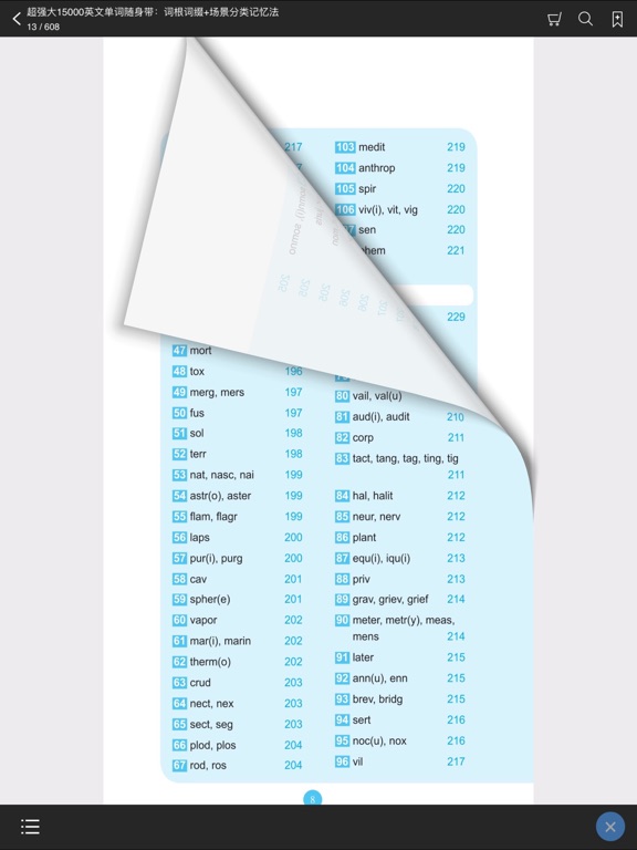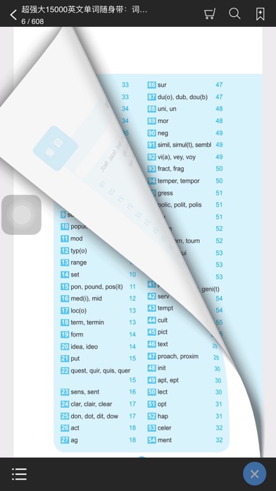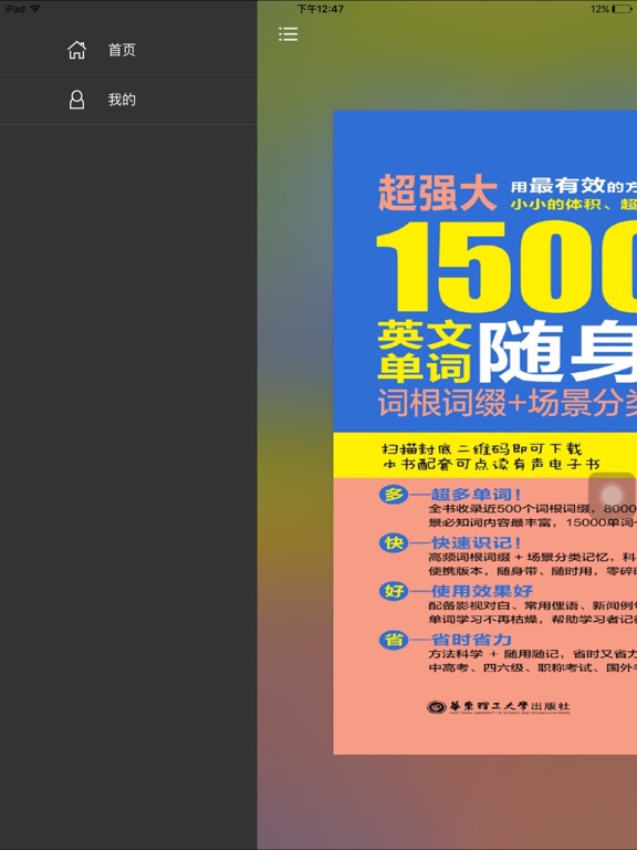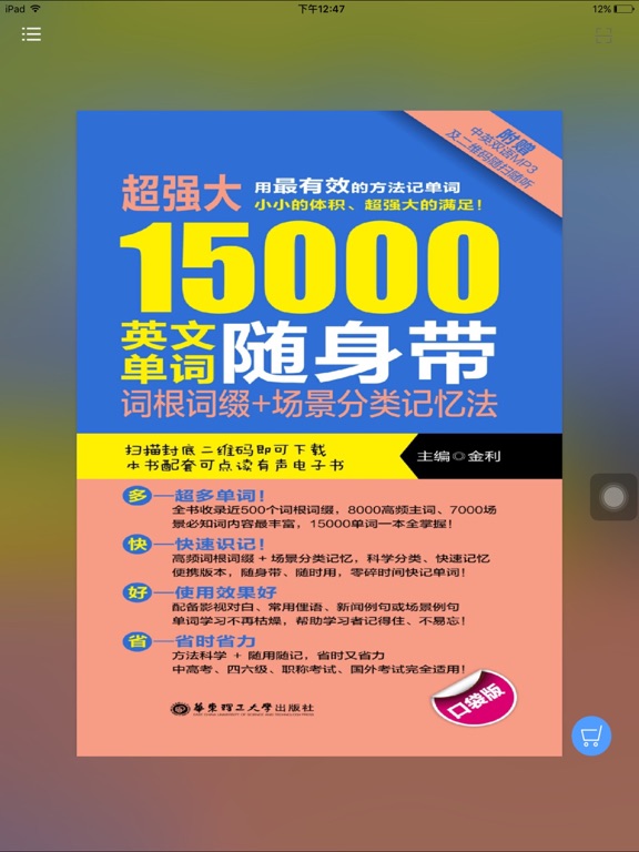 《15000英文单词随身带》官方正版App(有声点读) 每天海量单词随时听、随时学 《15000英文单词随身带》是由华东理工出版社出版的新手英语学习系列书中的一本。本书分别从词根词缀记忆和场景记忆两个角度入手,更好的帮助读者快速掌握海量词汇,深受广大英语初学者乃至赴欧美游客的喜爱。 全新的移动端“15000英文单词随身带”App,在完整还原纸书内容基础上,新增有声点读功能,邀请知名老师配音,还原逼真的英语语言环境,营造绝佳的轻学习氛围,随时随地看听学,尤其适合白领、学生等利用碎片时间学习! 【App内主要内容】 包含两部分,词根词缀记忆和场景记忆,系统划分海量单词(纯正配音) 【应用特色】 官方出品,保证原汁原味的内容呈现 有声点读,营造纯正英语的学习氛围 编排极简,全面利用您的碎片化时间 一键支付,免去纸书购买的种种烦恼 本App由华东理工大学出版社联手“阅门户”团队倾情打造。 【联系我们】 e-mail:service@readoor.cn 技术支持:029-68518879修改了一些细小bug;