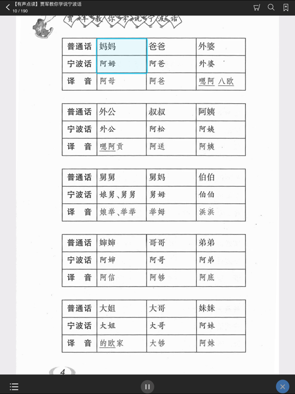 《学说宁波话》官方正版App(有声点读) 宁波话,点一点、学一学! 《学说宁波话》是一本宁波话教学工具书,一册在手,虽不足以精通宁波方言,却能促使他们较快地融入宁波,让他们在生活、工作或社交场合中不仅能听懂宁波话,而且也能慢慢地使用方言与宁波人交谈、沟通,最终融入宁波生活。 哪怕你对宁波话一无所知,也可以按照本书的普通话与宁波话对照以及相应的文字注音慢慢地悟出究竟什么是宁波话,并从而能在紧急场合说出所需表达的宁波话,达到与当地人交流与沟通的目的。 【App内主要内容】 全新的移动端“学说宁波话”App,在完整还原纸书内容基础上,新增有声点读功能,还原逼真的方言环境,邀请专家配音,用户随时随地可以点一点、看一看、学一学,无论是纯粹出于兴趣体验,还是传承地方文化,都有积极的示范意义。 【应用特色】 官方出品,保证原汁原味的语音呈现 有声点读,营造纯正宁波方言的氛围 编排极简,全面利用您的碎片化时间 一键支付,免去纸书购买的种种烦恼 本App由宁波出版社联手“阅门户”团队倾情打造。 【联系我们】 e-mail:service@readoor.cn 技术支持:029-685188791、适配ios13; 2、修复了部分bug。
