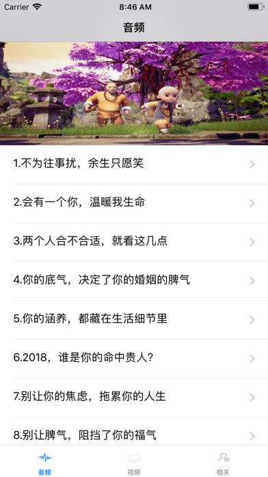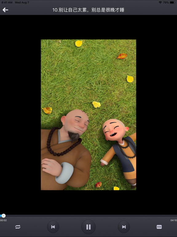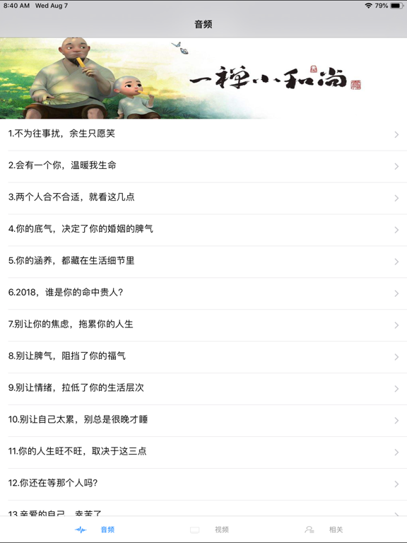 为和尚的不拘戒律,为妖精的不善邪道,跻身红尘的历劫红尘种种,山还是那座山,庙还是那座庙,一禅和师父迎来送往一个个故事,总会有一个,让你一边流泪,一边微笑。 《一禅小和尚》是一部网络动画,主人公一禅是一个6岁的小男孩儿。聪明可爱,调皮机灵,和师父阿斗老和尚上演着有趣温情的故事。 一禅因为被阿斗老和尚捡起并收养,因此自小在庙里当小和尚。在一禅喜欢问师傅问题,每次师傅都会讲出一些道理,帮助一禅成长。 讲述了小和尚一禅和师父以及身边各种人和事,并从中领悟人生的道理,领会身处尘世的芸芸众生的喜怒哀乐,怨憎会爱别离与求不得。用小和尚的视角看世界,用老和尚的话语去阐述人生的各种道理。 一禅小和尚 一禅小和尚是一个善良活泼,聪明可爱的小男孩儿,情窦未开却对什么都充满好奇。幼时被父母抛弃,老和尚捡来,从此在庙里当和尚。 慧远老和尚 慧远老和尚是一个阅历广泛,入佛门已久却又似乎未完全出世的人。表面上大大咧咧,爱面子甚至有点好色,内心却是一个非常温暖慈祥,大智若愚的人。曾救起被父母遗弃在深山的一禅,把一禅带大。此版本新增: 增加本地视频功能; 增加记忆播放功能: 优化语音系统: 适配iPhone X屏幕尺寸; 修复语音转换不过去bug;