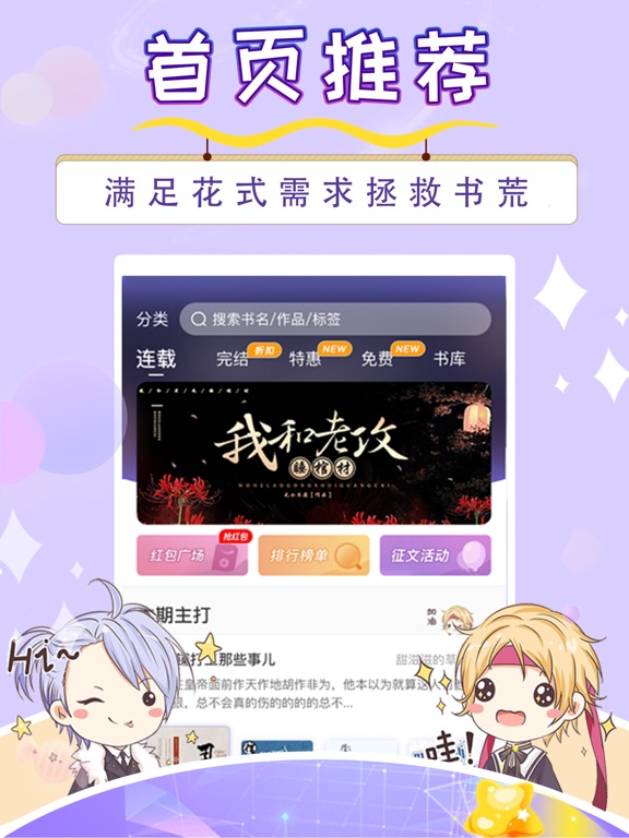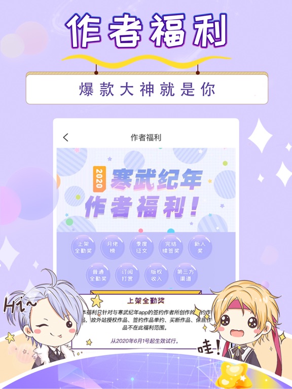 寒武纪年小说APP,纯爱小说,BL,耽美小说,剧情流、轻小说、爽文、恋爱、二次元文学爱好者的宝藏基地,不仅可以收藏阅读精彩有趣的纯爱,还可以拿起笔来创作,写出你心中的纯爱故事,更可以聆听声音好听的小哥哥的纯爱广播剧和有声小说。 【好看的纯爱耽美小说】先婚后爱,追妻火葬场,穿越重生、现代都市、青春校园,古代架空、豪门恩怨、悬疑推理、灵异恐怖、系统空间、星际机甲、科幻未来、ABO生子、打脸虐渣各种题材应有尽有。带感的人设、狗血的情节、超乎想象的背景设定满足广大女生的各种期待。 不仅可以与你喜欢的作者交流沟通,给喜爱的太太们打call,更可以和一起阅读的女性朋友们畅意讨论,阅读从此不再会孤单。 【好听的纯爱耽美有声广播剧】奶萌音、大叔音、霸道总裁音等各种磁性男声任意切换,伴您入睡,让你享受最纯粹的听书环境。每月都会有新书有声进行录制,满足你边看边听的极致享受。更有超好听的广播剧供您选择,还可发布实时弹幕,边听边聊。 这里的播放环境跟喜马拉雅,蜻蜓,猫耳一样带感。 【优质的纯爱耽美创作环境】假如你是纯爱写手,这里不仅会提供快捷简单好用的写作工具,可以手机电脑同步创作,还可参加季度征文最高奖金5000元等多样的福利活动,最高全勤奖高达5000元,奖金福利一叠加,一本合并单月可上万,加上分成其他福利改编收入,一次多开几本书,写纯爱小说进行养家养娃养狗养猫养车养房不是梦! 现更有夏季征文,月度征文,保底买断收稿、签约分成等多种投稿方式,可签书,可签人,可保底,可买断,不管是新人还是大神,只要能产出优质作品+稳定更新,新人也有贴吧,微博,公众号等多种站外推广渠道,同时还有机会,被改变成有声小说和漫画,登录喜马拉雅腾讯动漫番茄小说猫耳掌阅等知名平台,还不快点撩我们! 寒武纪年小说APP,虽然没有晋江文学城,长佩阅读,废文网那么有名气,但是这里的纯爱小说也非常好看哦~而且还有好听的广播剧和有声读物。 如果你喜欢看魔道祖师,天官赐福之类的仙侠文,这里有《影帝是只白狐妖》《男妃在上》这样精彩的好文。如果你喜欢看纯爱漫画,恋爱小说,二次元小说,这里一定会让你满意的。也可认识喜欢瓶邪,里番,外番,小说,漫画同好。 寒武纪年小说APP,追不完的纯爱小说,听不够的纯爱原创有声小说和广播剧,停不下来的更新速度,说不完的剧情交流,寒武纪年小说APP一直在等待着你们~【添加】实名认证 上万本精彩、好看、有趣纯爱BL耽美小说任你挑选~ 各种多人有声小说、精选广播剧等着你~ 更多纯爱榜单定时更新,包月会员享受更多购买优惠,为你推荐热门书籍! 来寒武纪年,看纯爱耽美BL故事,听纯爱耽美BL小说,笔芯~