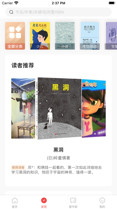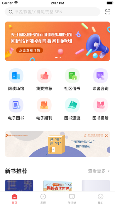 书香园区是专门提供给苏州独墅湖图书馆读者进行网上图书借阅的软件平台;读者网上借阅成功的图书将安排物流送至读者选择的取书点,并对图书的物流状态进行跟踪,及时提醒用户物流状态;书香园区提供以下但不仅限于以下功能: 1:读者进行网上借阅、图书物流信息跟踪与反馈 2:读者可对优质的书籍进行书评的填写 3:图书漂流、图书捐赠让闲置书籍发挥更大的能量 4:读者证切换,让读者借阅到更多的书籍 5:多种登录方式,让登录不再单一1.优化部分功能 2.修复已知问题