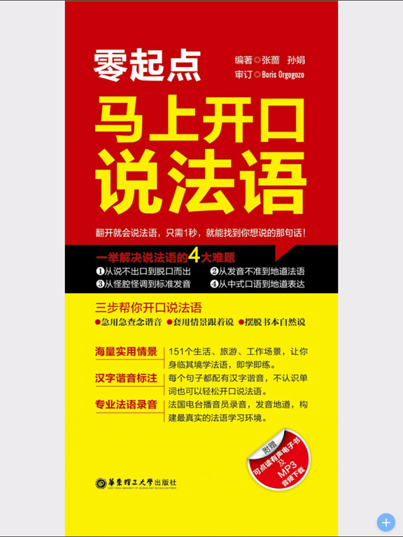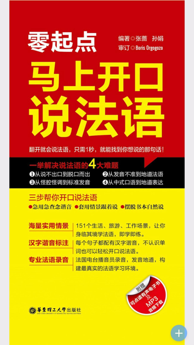 《零起点,马上开口说法语》纸书官方正版App(有声点读) 法语新手必备神器,场景式语言学习 《零起点,马上开口说法语》是由华东理工出版社出版的法语新手系列丛书中的一本。本书植入真实可感的生活情境,邀请专业法国播音员录音,三步帮你开口说法语:急用急查念谐音、套用情景跟着说、摆脱书本自然说。 全新的移动端“马上开口说法语”App,在完整还原纸书内容基础上,优化阅读体验,新增极具实用性的有声点读功能,还原逼真的法语语言环境,营造绝佳的轻学习氛围,成为您手机里的随身法语老师! 【App内主要内容】 日常寒暄、居家生活、生活服务、交通出行、旅游度假等15个真实场景。 【应用特色】 官方出品,保证原汁原味的内容呈现 有声点读,营造纯正法语的学习氛围 编排极简,全面利用您的碎片化时间 一键支付,免去纸书购买的种种烦恼 本App由华东理工大学出版社联手“阅门户”团队倾情打造。 【联系我们】 e-mail:service@readoor.cn 技术支持:029-68518879Apple 已更新此 App 以显示 Apple Watch App 图标。 1.优化应用版本性能,提高用户阅读体验; 2.适配iphone x; 3.修改细小bug.