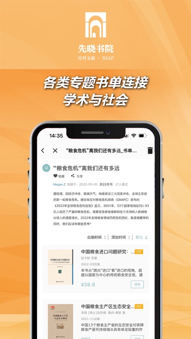 先晓书院是由社会科学文献出版社创建的集电子书、音视频资源、知识服务等为一体的数字化学术服务官方平台。 目前,平台图书涵盖了出版社包括甲骨文、索恩、启微、九色鹿、方寸、思想会、OWN阅读等在内的全部学术品牌内容,涉猎社会学、经济学、历史学、国际关系学等15个分类学科,拥有超过16000本海量图书资源。作为2020年的新生力量,先晓书院旨在为广大人文社科领域学者、师生及学术爱好者打造一个集阅读、影音、科研、社交、传播的全方位数字学术共享空间。 【电子书】社科文献品牌图书、皮书系列、学术参考书应有尽有,海量图书电子版一站式获取,高效阅览,搭建个性化轻阅读平台。 【先读】最新书讯、精选文章、学术动态、学者沙龙信息全部掌握,先读为敬。 【先晓茶馆】读者可随时发表读书笔记、评论内容,自由创建主题书单,查看其他读者的在读内容,发现同道书友。线上多元互动,构筑趣味学术交流空间。 【作者服务】社科文献在发布《作者手册》的同时,全面优化作者社区,为广大作者提供含作品出版在内的在线服务。 【有声书】部分有声书上架,欢迎随时随地畅听图书。提升用户体验,修复已知问题